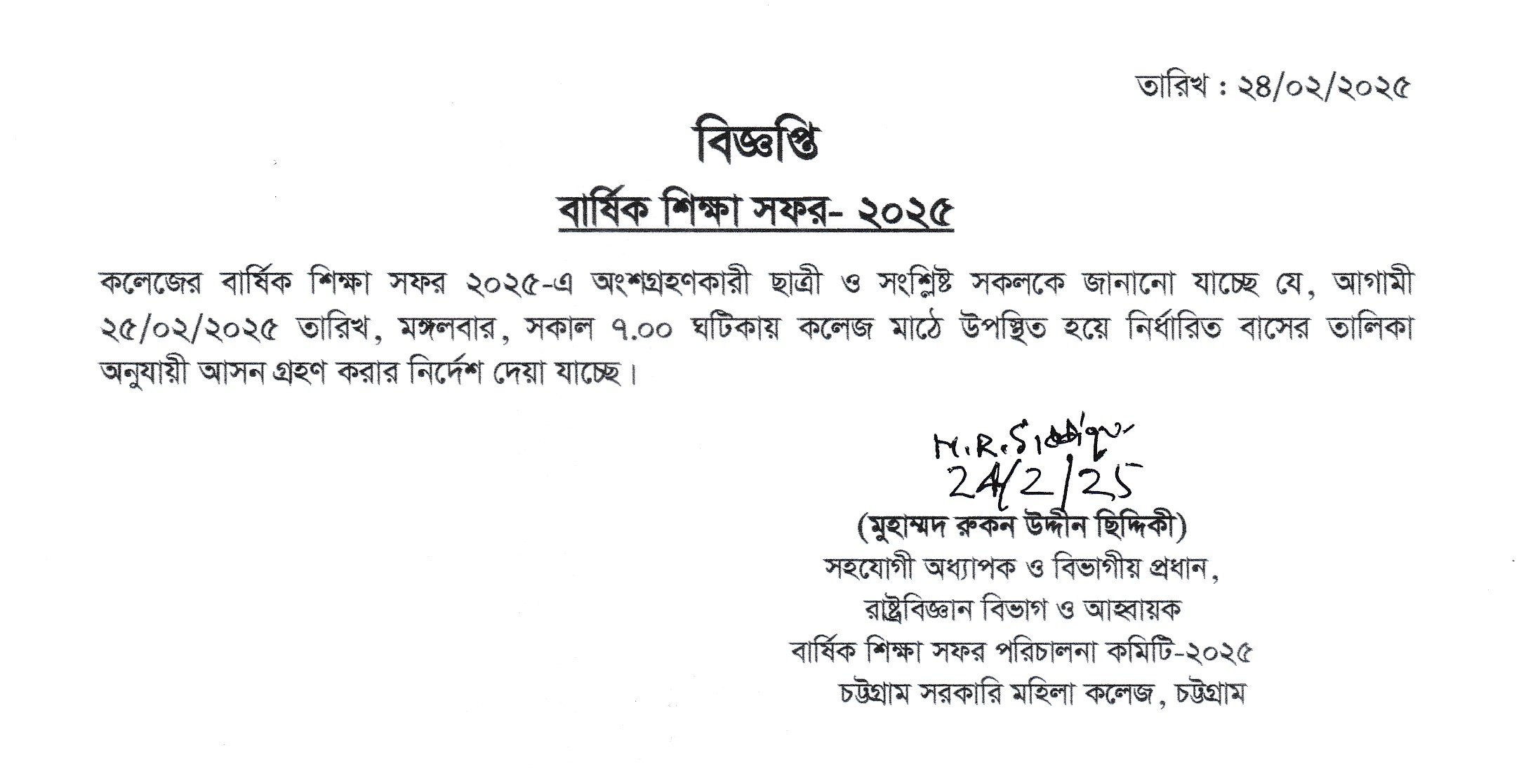 আগামী ২৫/০২/২০২৫ তারিখ কলেজের বার্ষিক শিক্ষা সফর ২০২৫-এ উপস্থিত থাকা প্রসঙ্গে