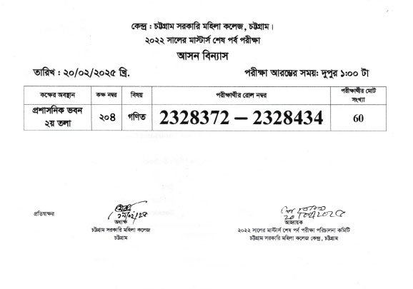 আগামী ২০/০২/২০২৫ তারিখের মাস্টার্স শেষ পর্ব পরীক্ষার আসন বিন্যাস