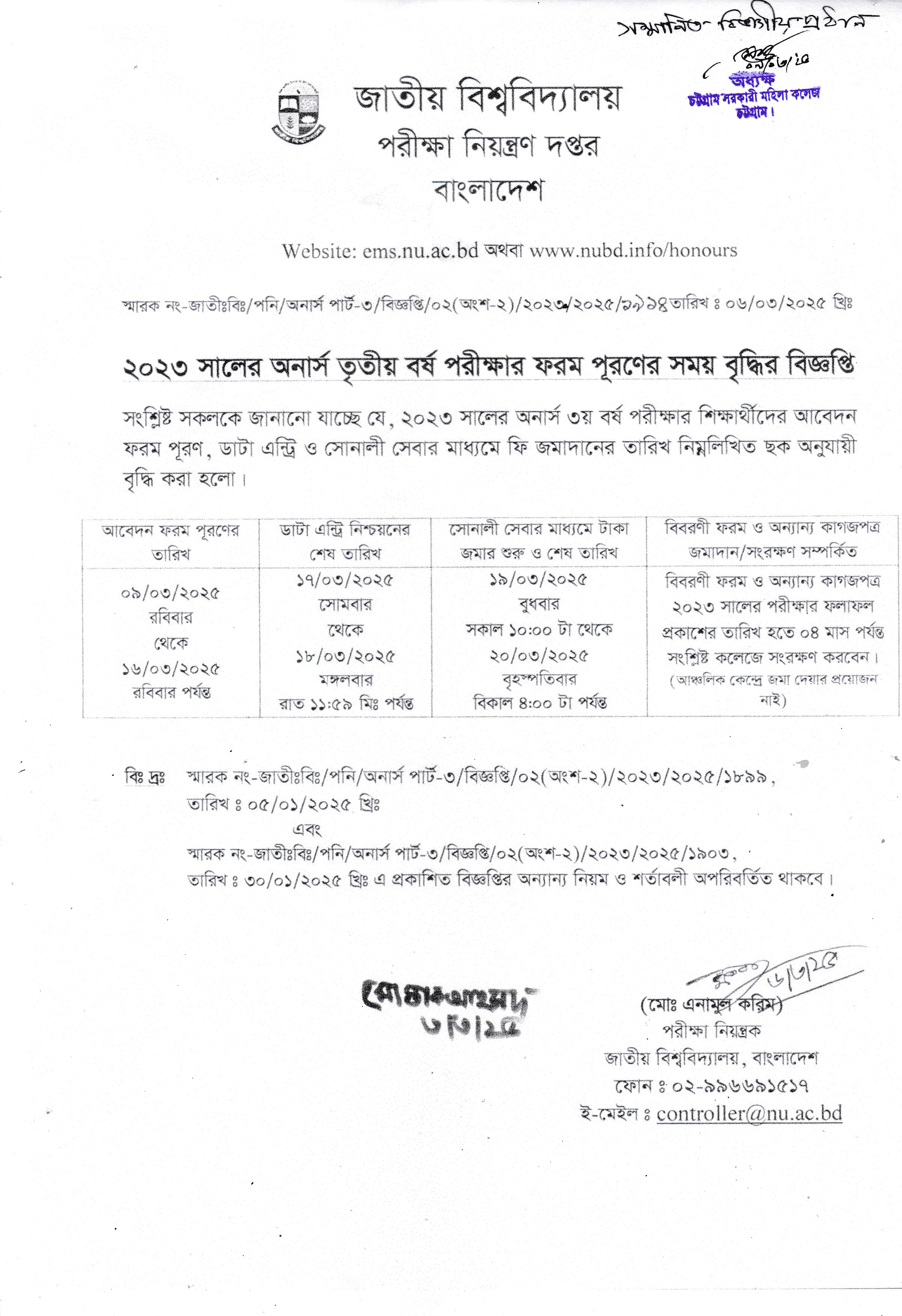 অনার্স ৩য় বর্ষ পরীক্ষা-২০২৩ এর ফরম পূরণের সময়বৃদ্ধি সংক্রান্ত বিজ্ঞপ্তি (০৯/০৩/২০২৫)