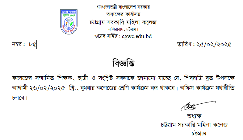 আগামী ২৬/০২/২০২৫ তারিখ, শিবরাত্রি ব্রত উপলক্ষে শ্রেণি কার্যক্রম বন্ধ সংক্রান্ত বিজ্ঞপ্তি