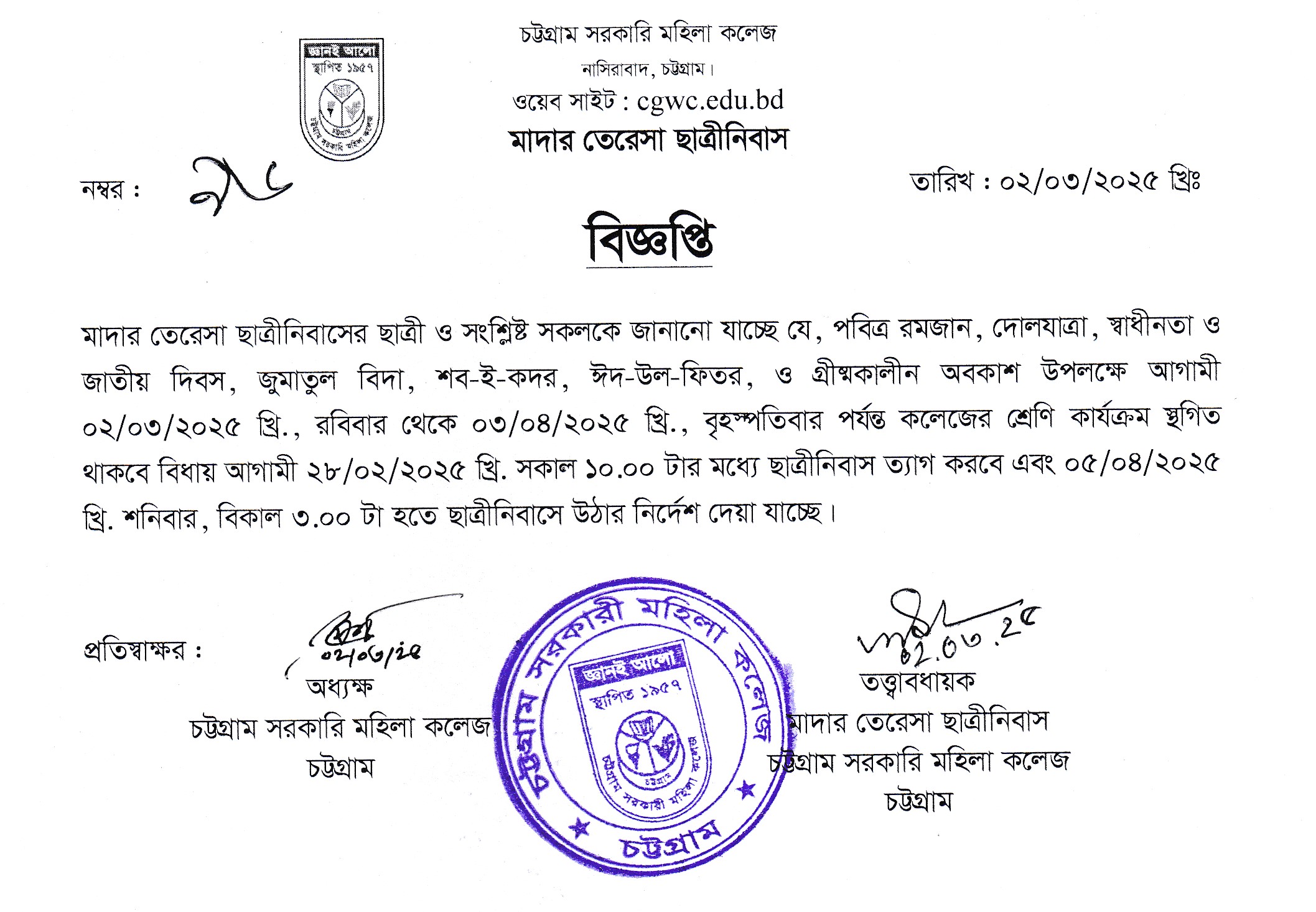 অধ্যক্ষ (ক্যাপ্টেন) রওশন আখতার হানিফ ছাত্রীনিবাস বন্ধের বিজ্ঞপ্তি