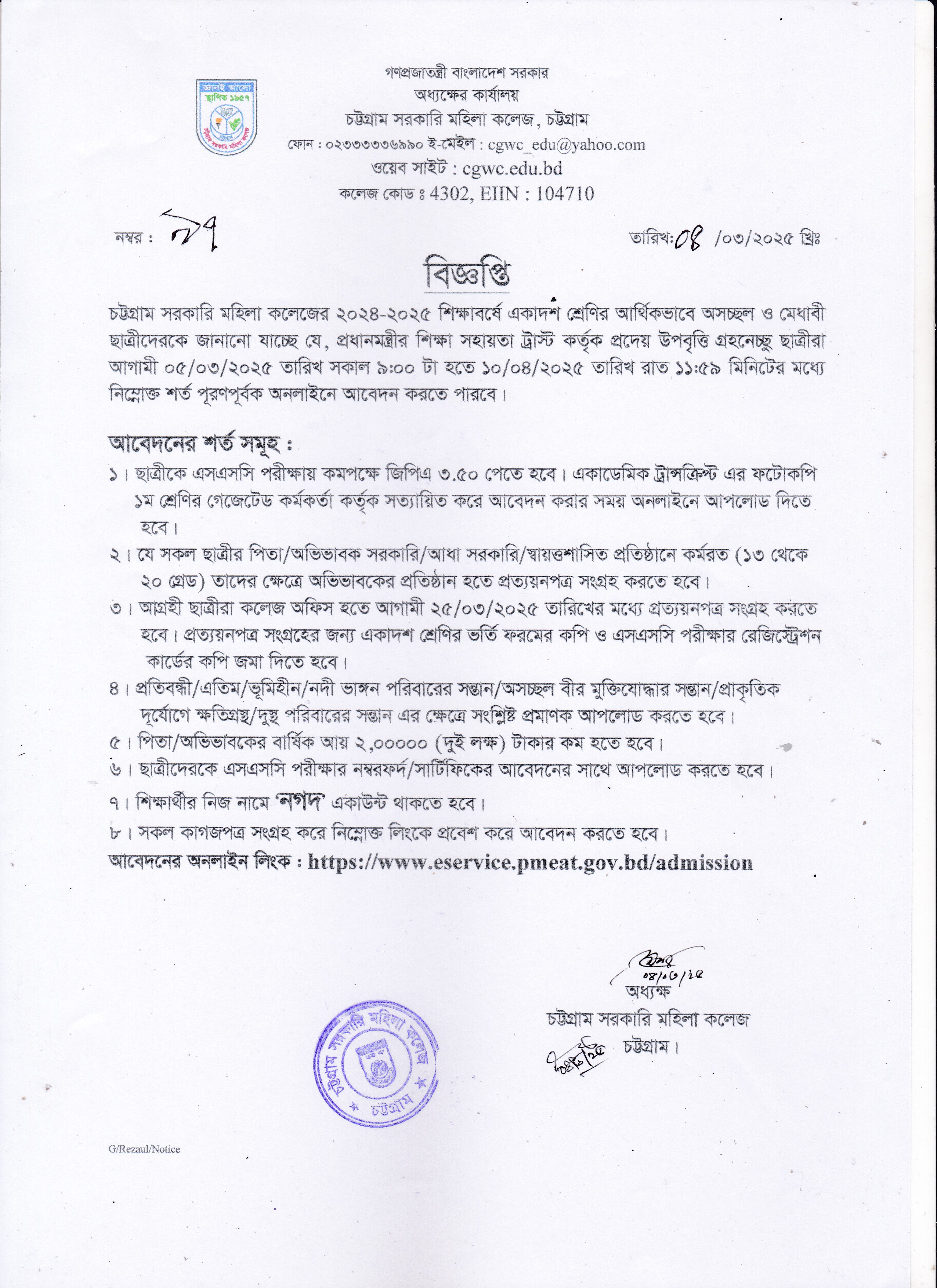 ২০২৪-২০২৫ শিক্ষাবর্ষে একাদশ শ্রেণির দরিদ্র ও মেধাবী ছাত্রীদের শিক্ষা সহায়তা প্রদান সংক্রান্ত বিজ্ঞপ্তি (০৪/০৩/২০২৫)