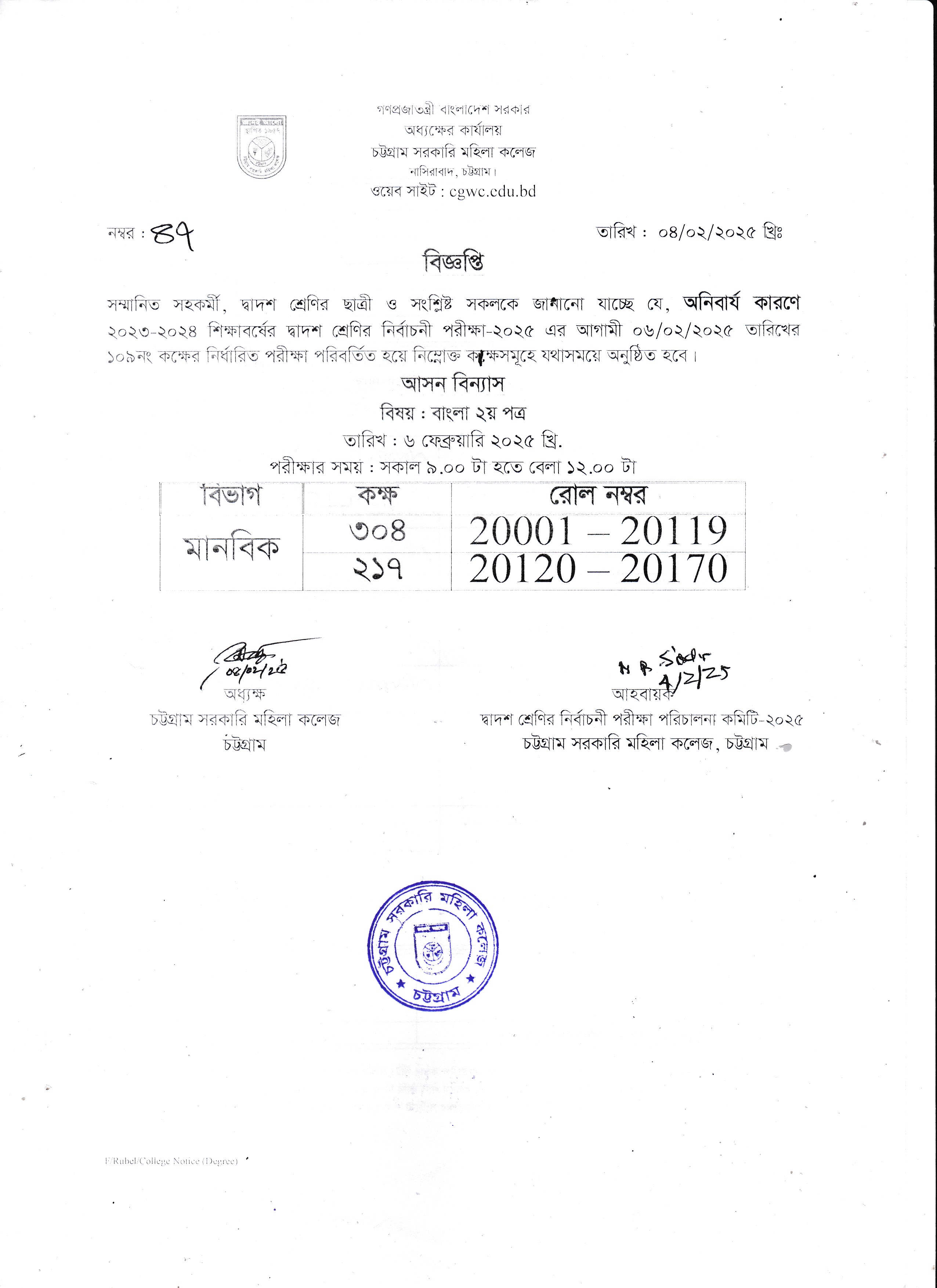 দ্বাদশ শ্রেণির নির্বাচনী পরীক্ষার আগামী ০৬/০২/২০২৫ তারিখের পরীক্ষার কক্ষ পরিবর্তন সংক্রান্ত বিজ্ঞপ্তি (০৪/০২/২০২৫)