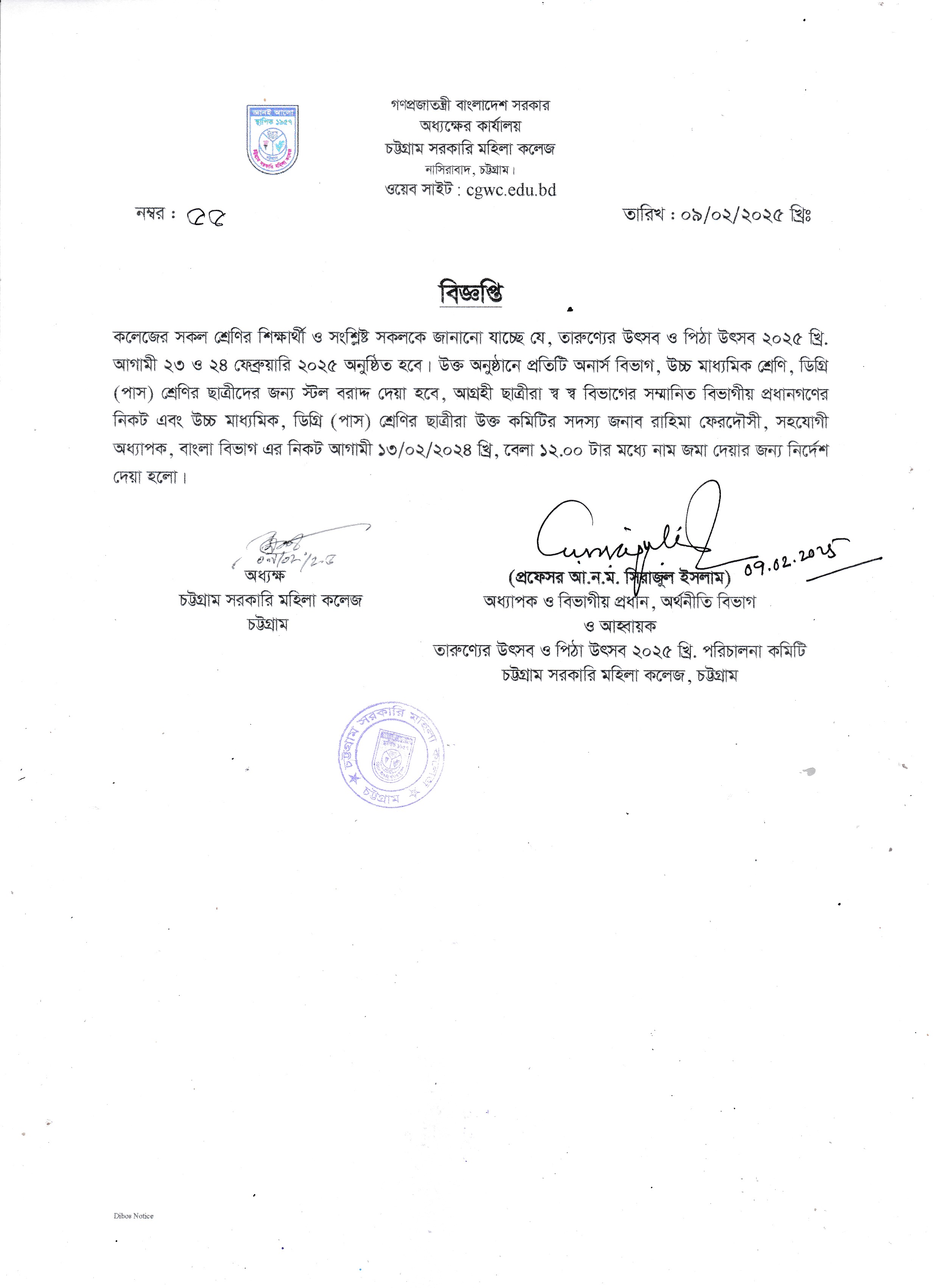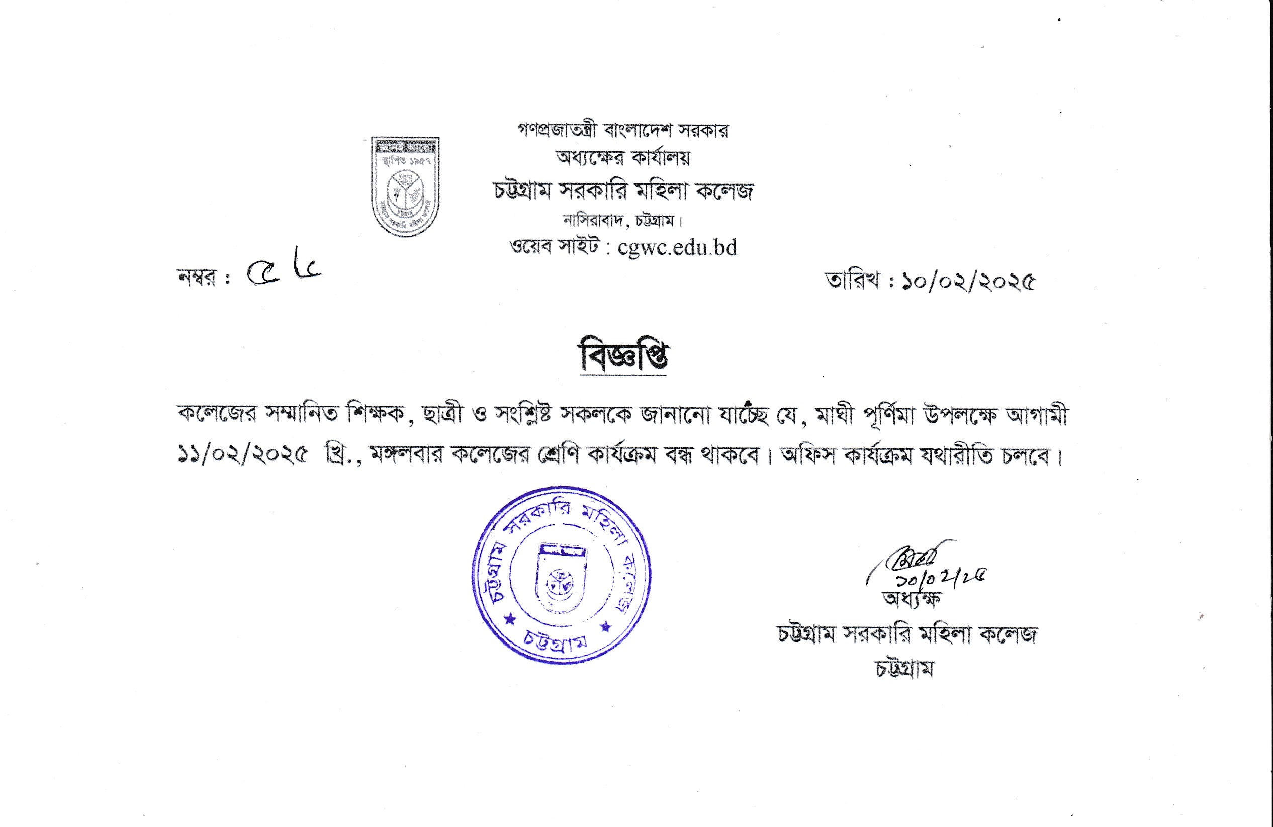 ২০২৩-২০২৪ শিক্ষাবর্ষে অনার্স ও ডিগ্রি (পাস) ১ম বর্ষের ছাত্রীদের ভর্তি সহায়তা প্রদান সংক্রান্ত বিজ্ঞপ্তি (০৬/০২/২০২৫)