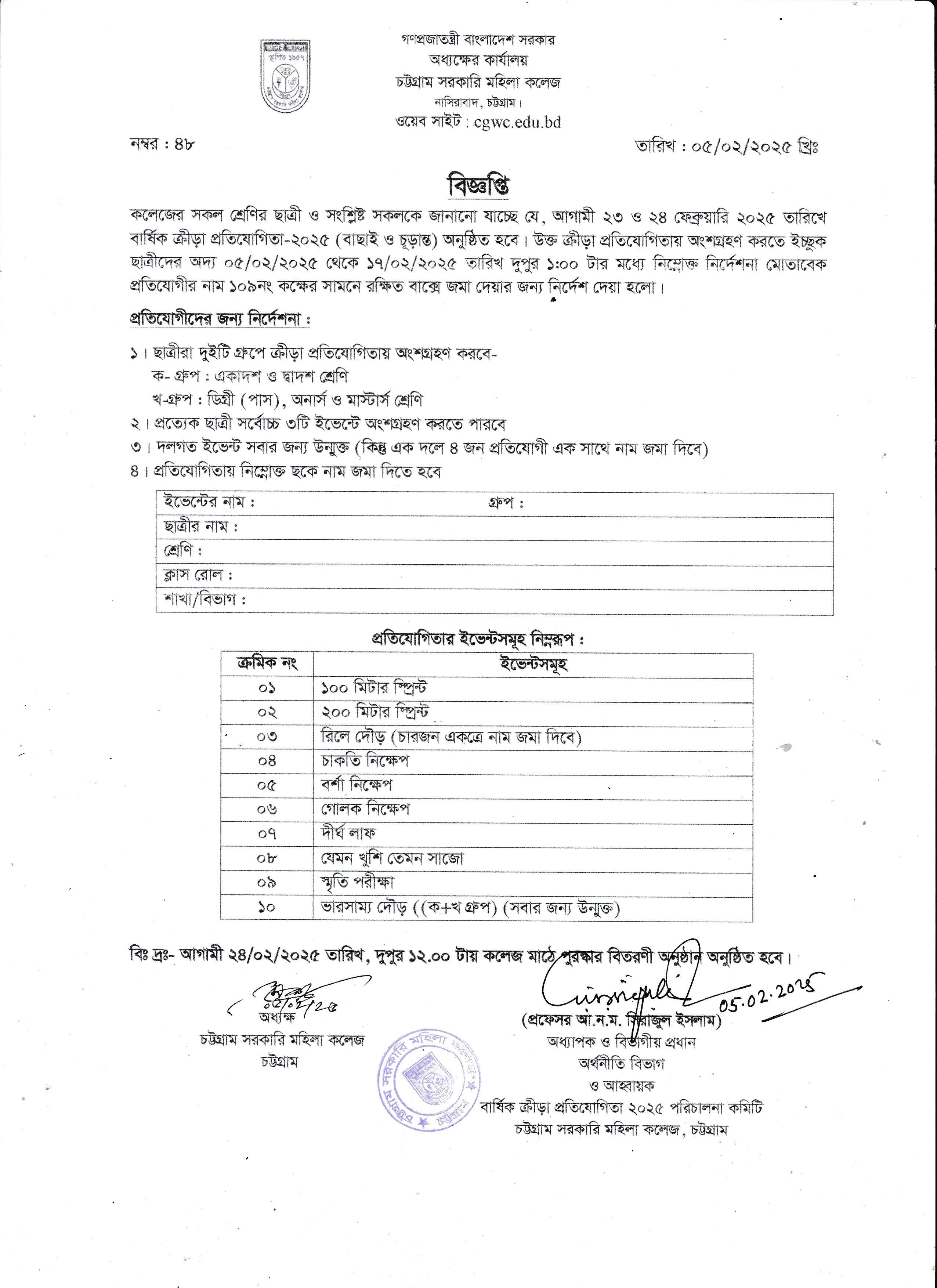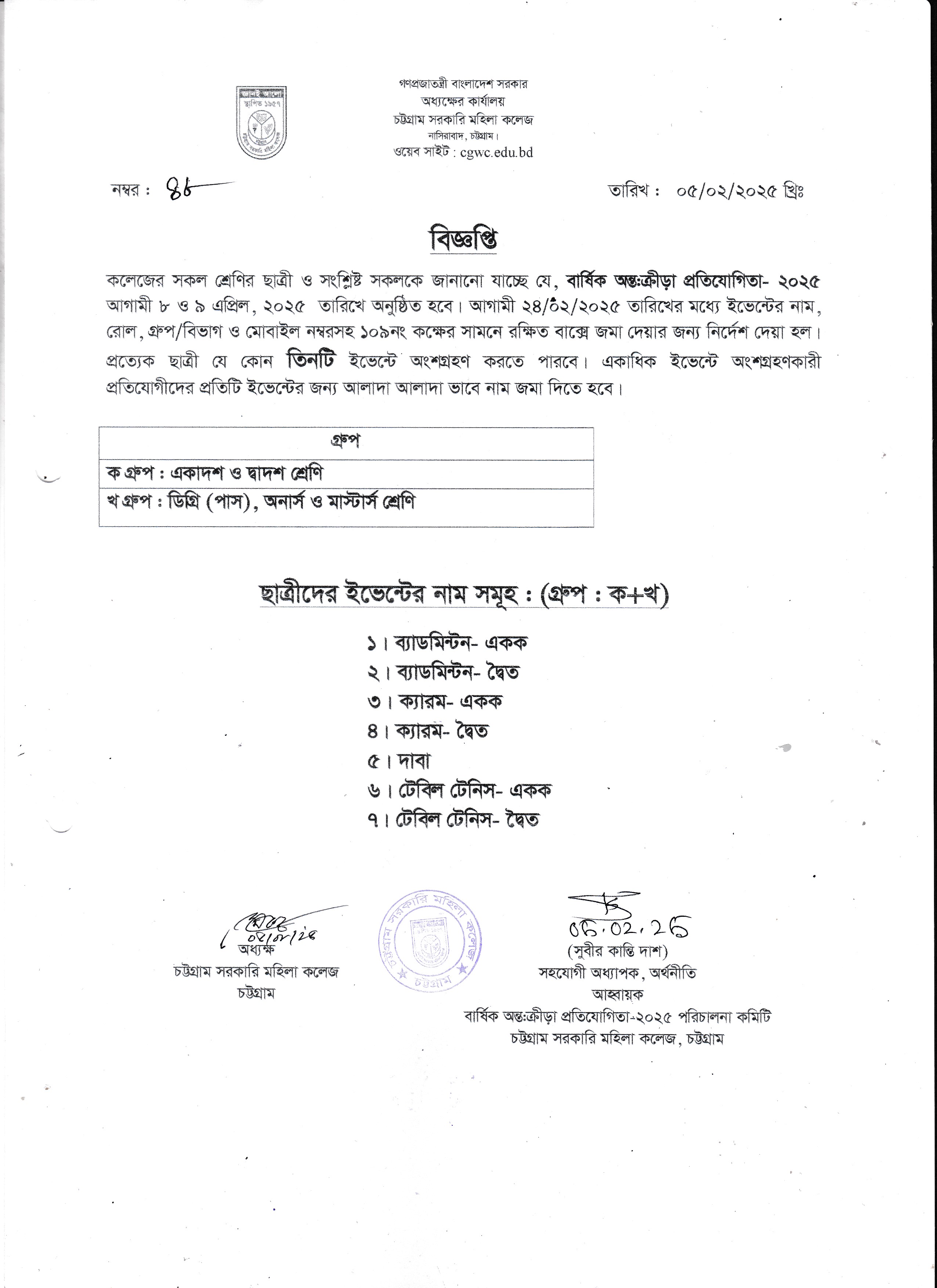 বার্ষিক ক্রীড়া প্রতিযোগীতা -২০২৫ সংক্রান্ত বিজ্ঞপ্তি (০৫/০২/২০২৫)