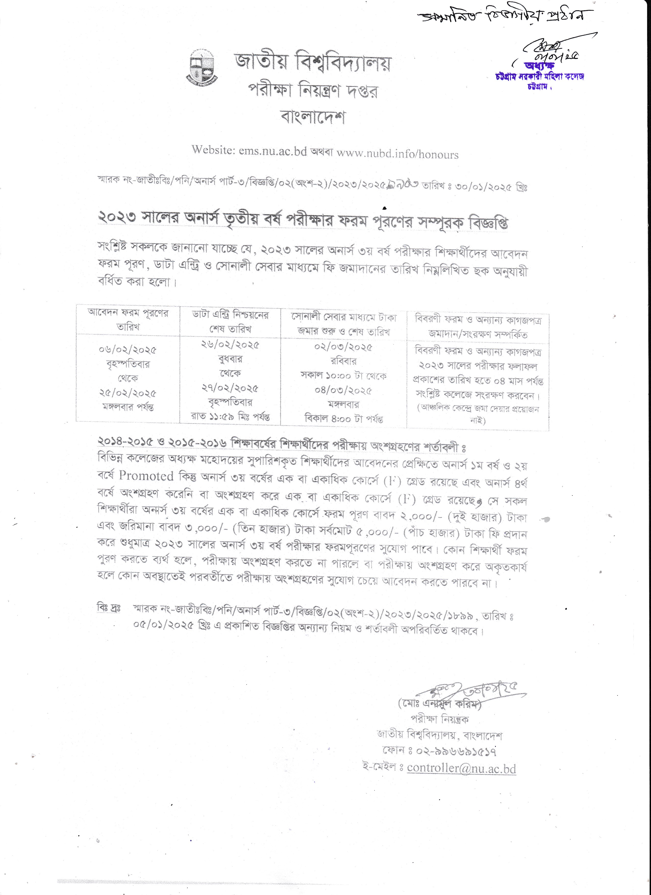 ২০২৩ সালের অনার্স ৩য় বর্ষ পরীক্ষার ফরম পূরণের সম্পূরক বিজ্ঞপ্তি (০৪/০২/২০২৫)