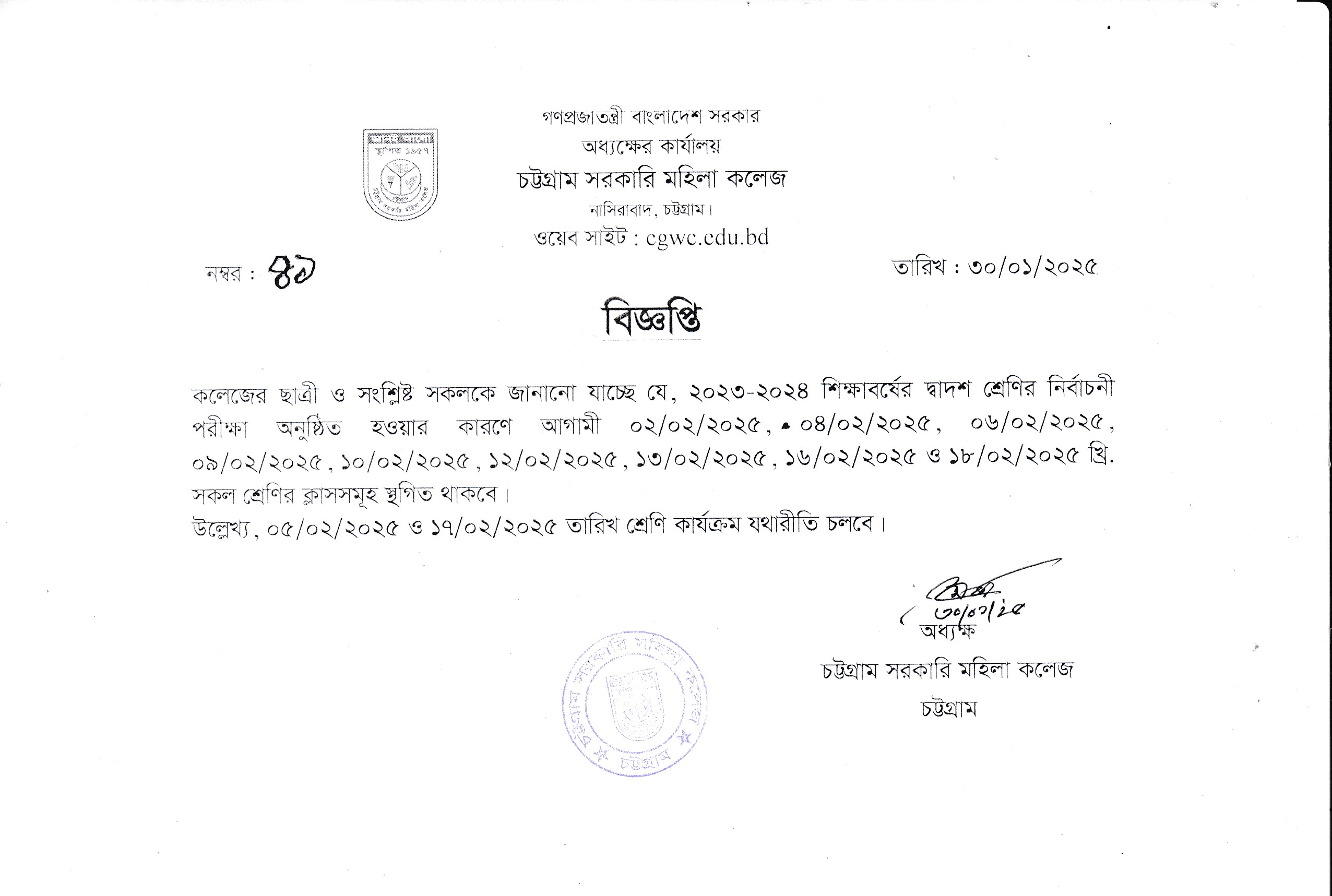 শ্রেণি কার্যক্রম স্থগিত সংক্রান্ত বিজ্ঞপ্তি (৩০/০১/২০২৫)