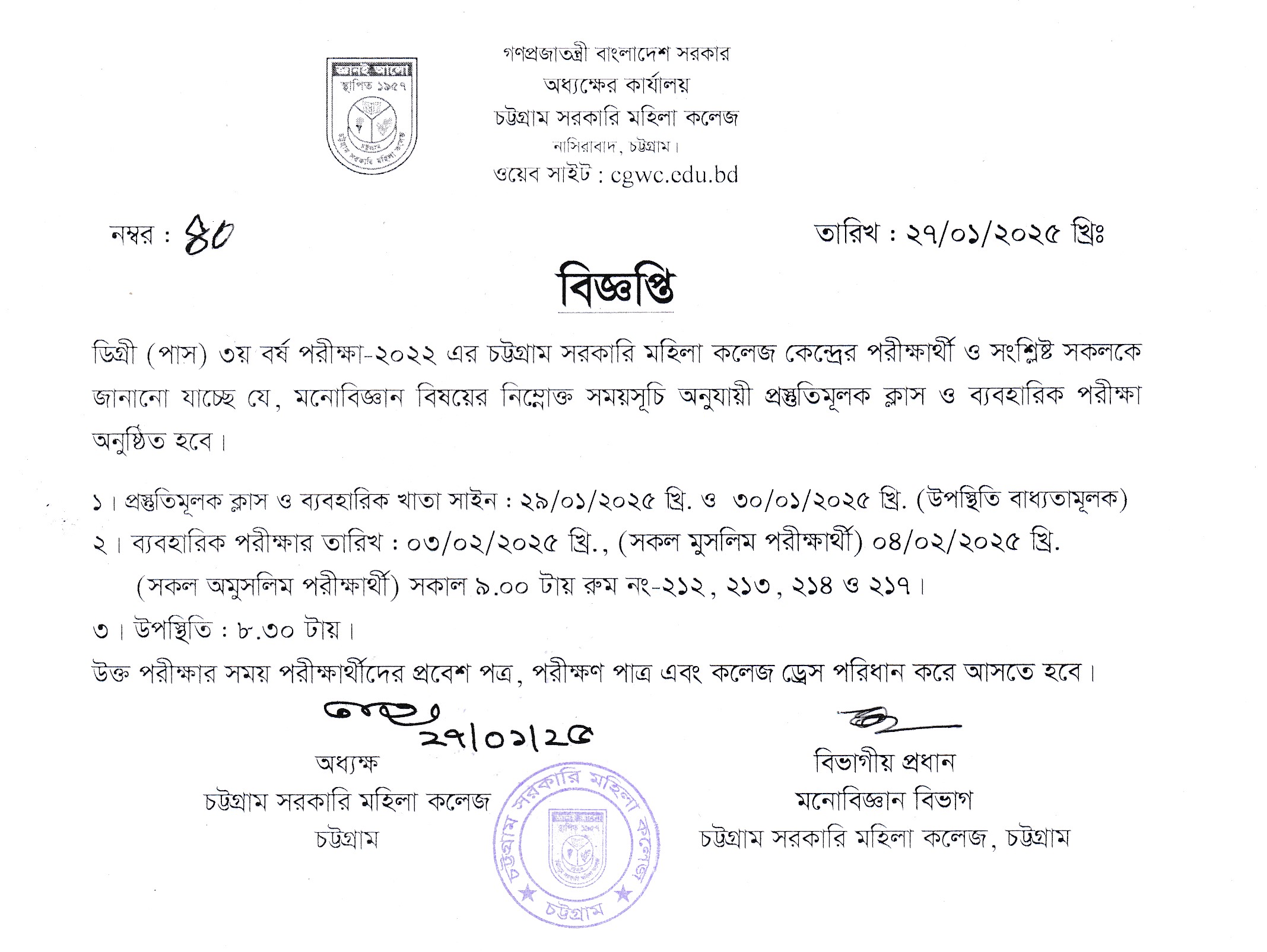 চট্টগ্রাম সরকারি মহিলা কলেজ কেন্দ্রের ডিগ্রী (পাস) ৩য় বর্ষ পরীক্ষা-২০২২ এর মনোবিজ্ঞান ব্যবহারিক পরীক্ষা সময়সূচি প্রকাশ