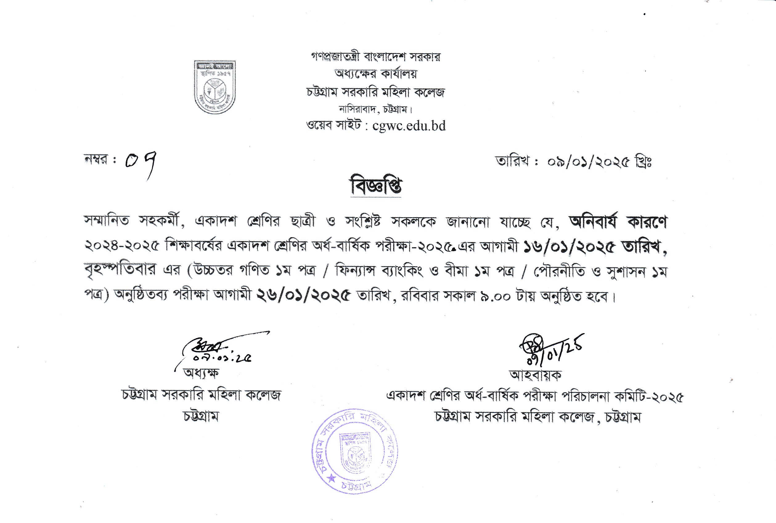 ২০২৪-২০২৫ শিক্ষাবর্ষে একাদশ শ্রেণির অর্ধ-বার্ষিক পরীক্ষার আগামী ১৬/০১/২০২৫ তারিখের পরীক্ষার তারিখ ও সময়সূচী পরিবর্তন সংক্রান্ত বিজ্ঞপ্তি (০৯/০১/২০২৫)