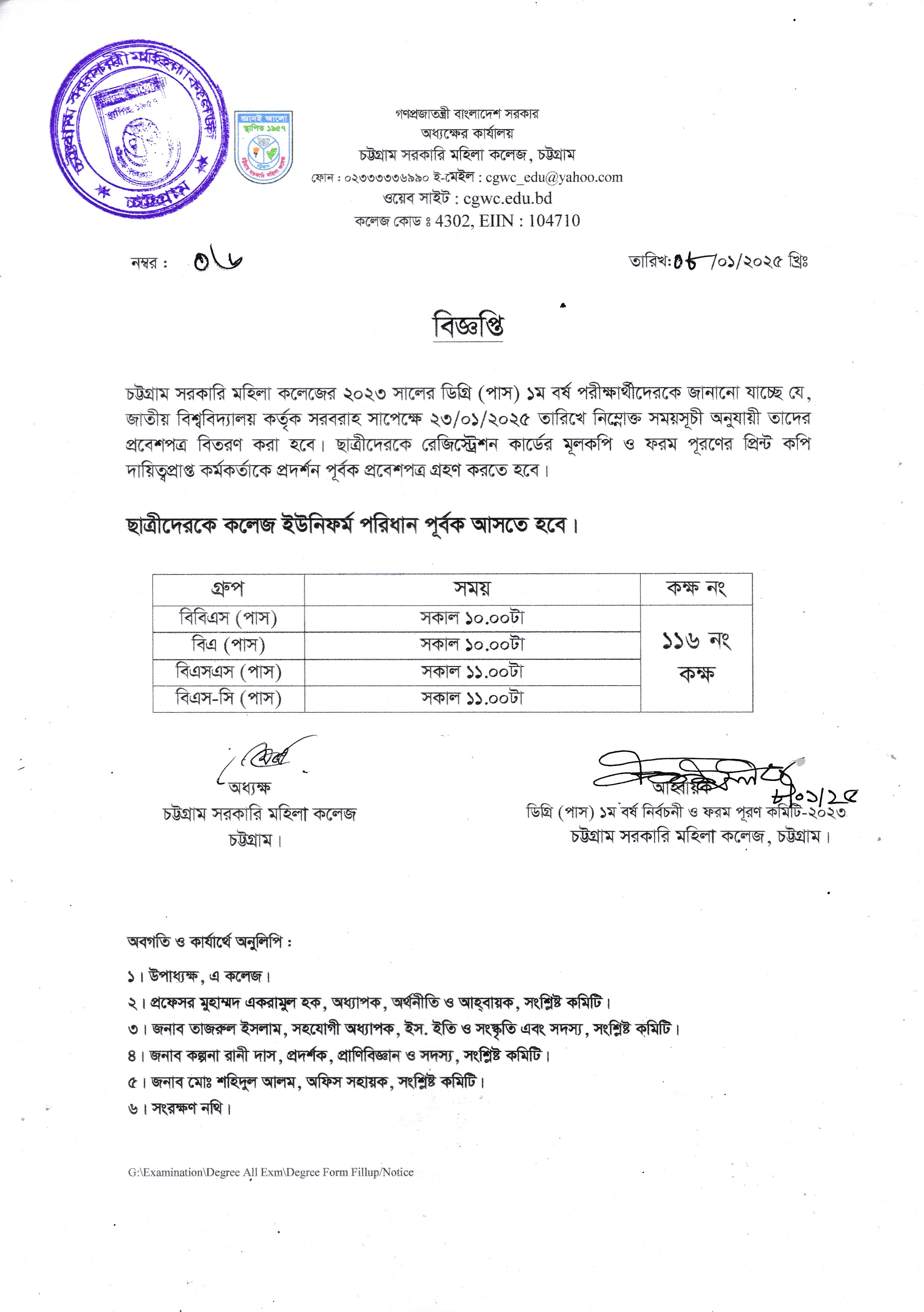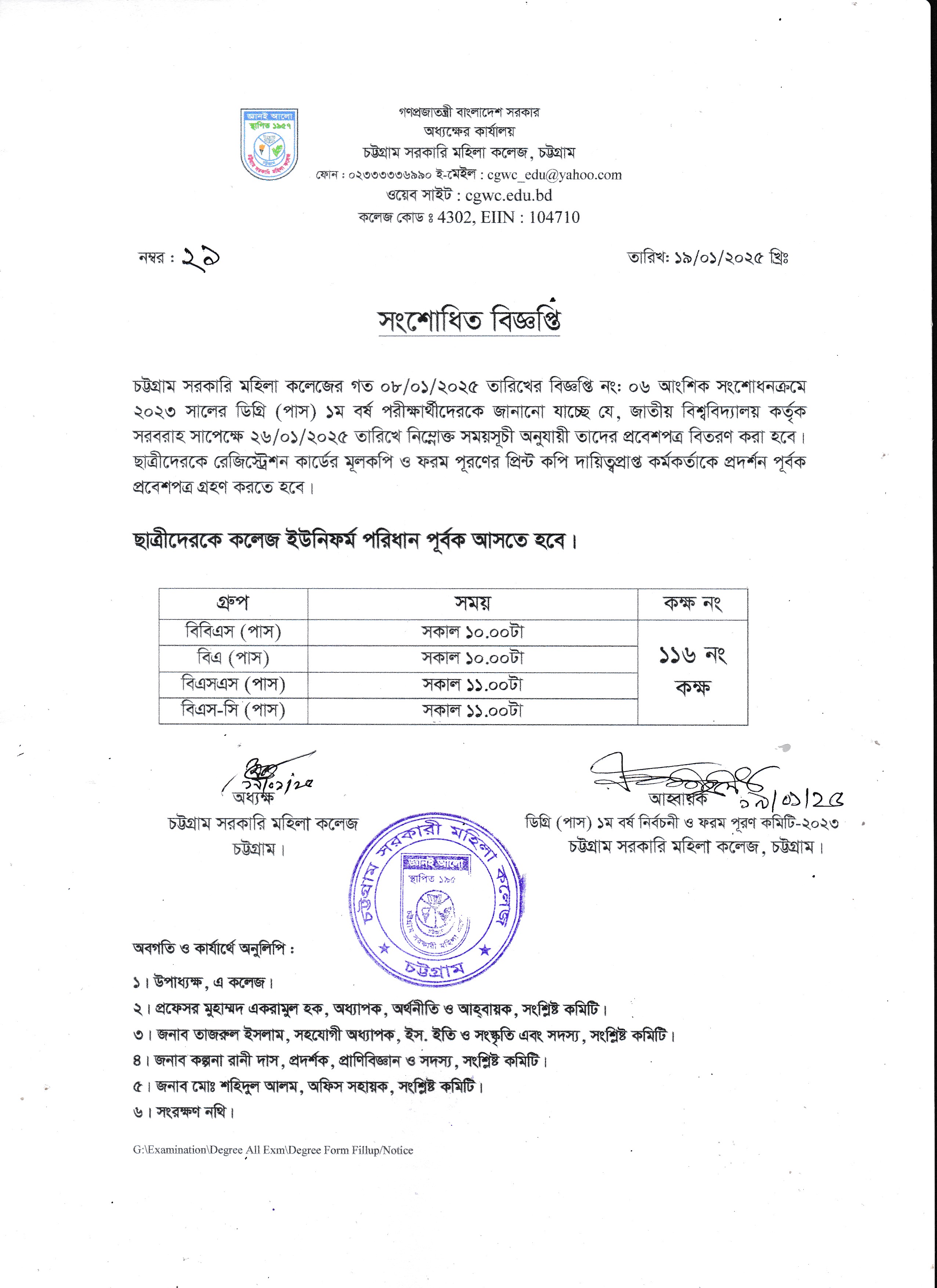 ডিগ্রি (পাস) ১ম বর্ষ পরীক্ষা -২০২৩ এর প্রবেশপত্র বিতরণের সংশোধিত বিজ্ঞপ্তি (১৯/০১/২০২৫)