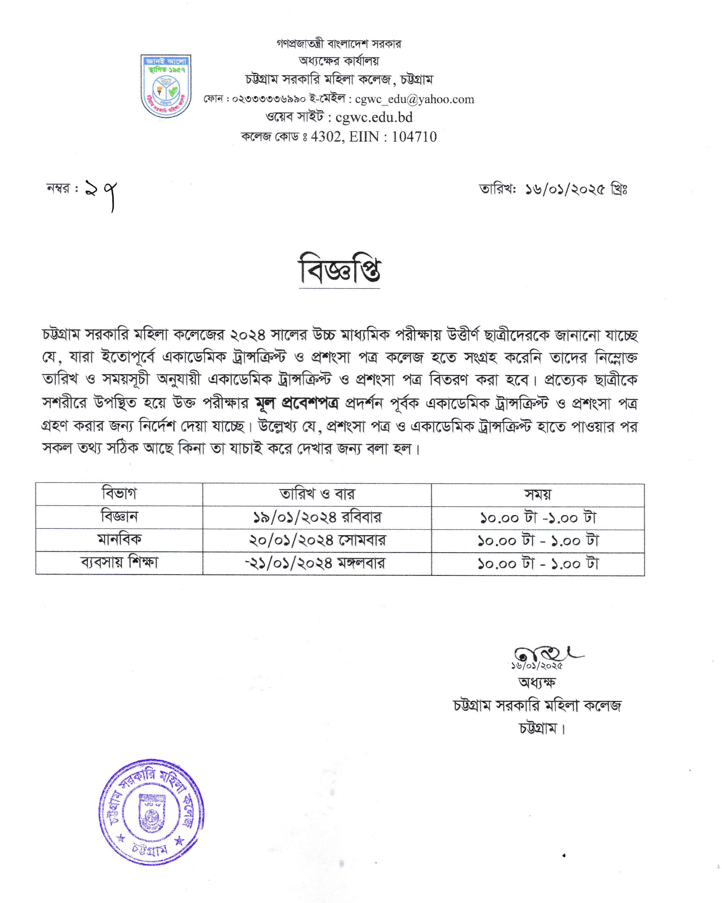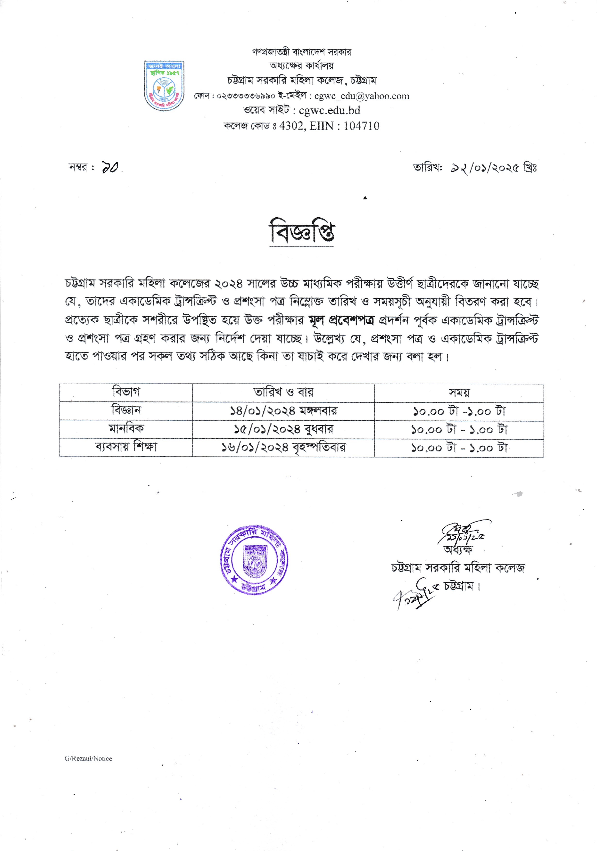 ২০২৪ সালের উচ্চ মাধ্যমিক পরীক্ষায় উত্তীর্ণ ছাত্রীদের একাডেমিক ট্রান্সক্রিপ্ট ও প্রশংসাপত্র বিতরণের বিজ্ঞপ্তি (১২/০১/২০২৫)