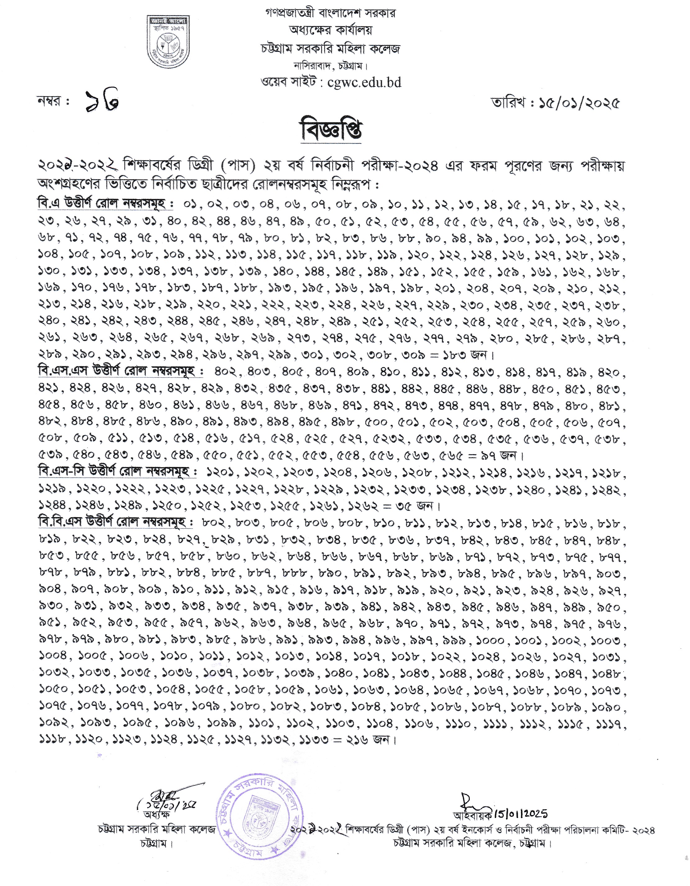২০২১-২০২২ শিক্ষাবর্ষের ডিগ্রী (পাস) ২য় বর্ষ নির্বাচনী পরীক্ষা-২০২৪ এর ফলাফল প্রকাশ