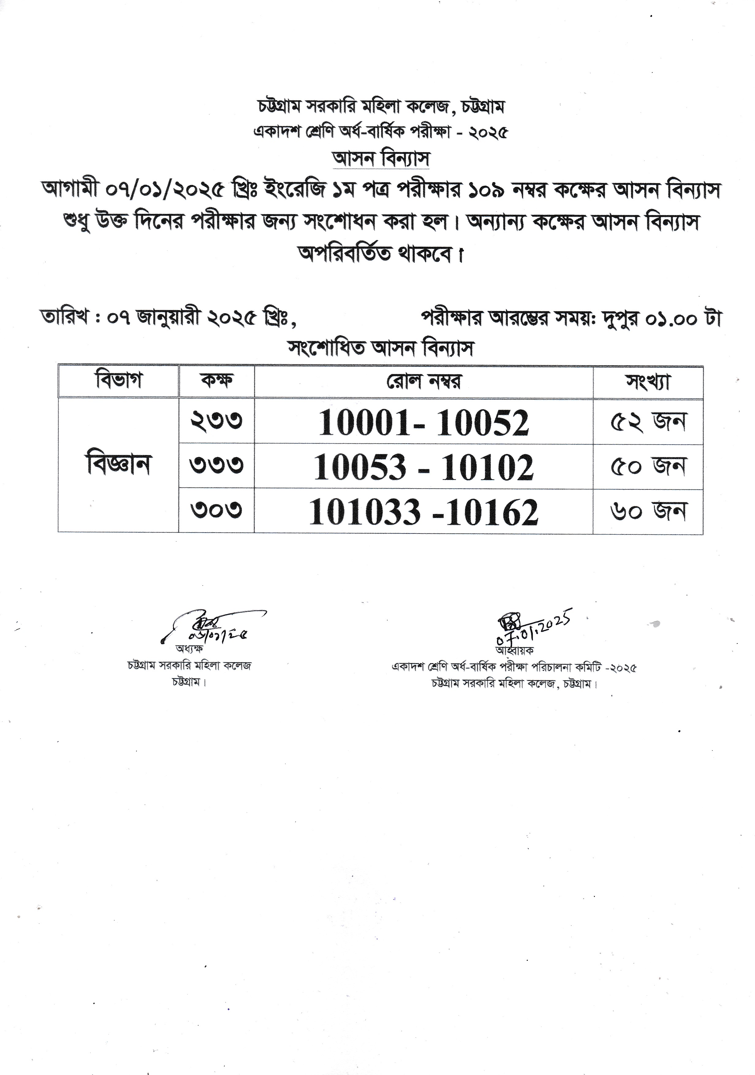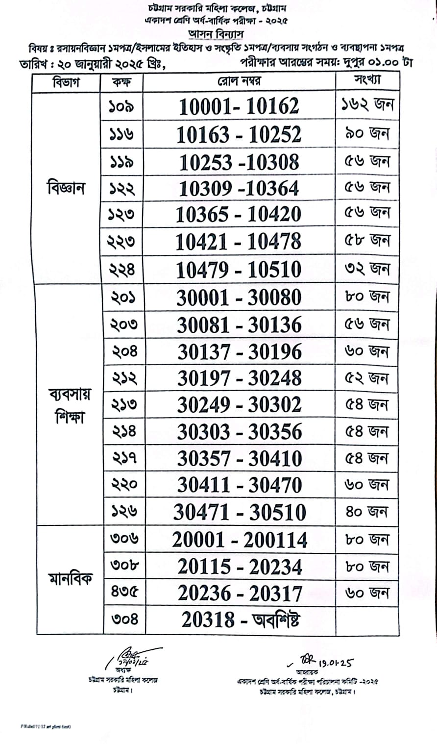 একাদশ শ্রেণির অর্ধ-বার্ষিক পরীক্ষা ২০২৫ এর আগামী ০৬, ০৭ ও ০৯ জানুয়ারী ২০২৫ তারিখের পরীক্ষার আসন বিন্যাস (০৫/০১/২০২৫)