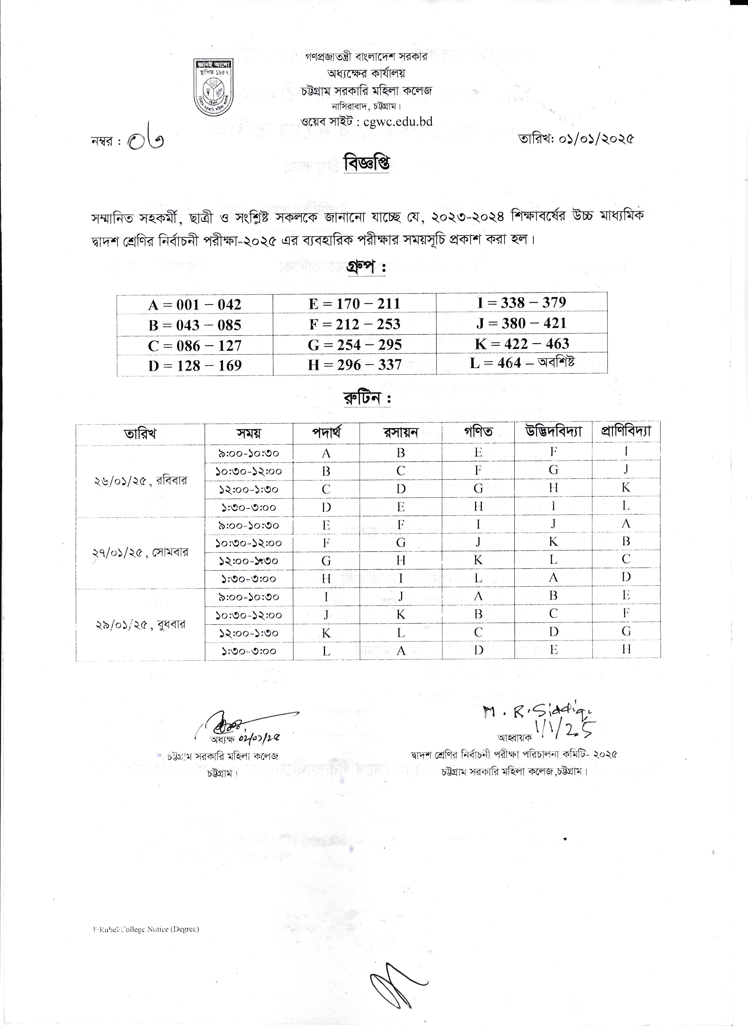 কলেজের একাদশ ও দ্বাদশ শ্রেণির সংশোধিত ক্লাস রুটিন (০৯/০১/২০২৫ খ্রি.)