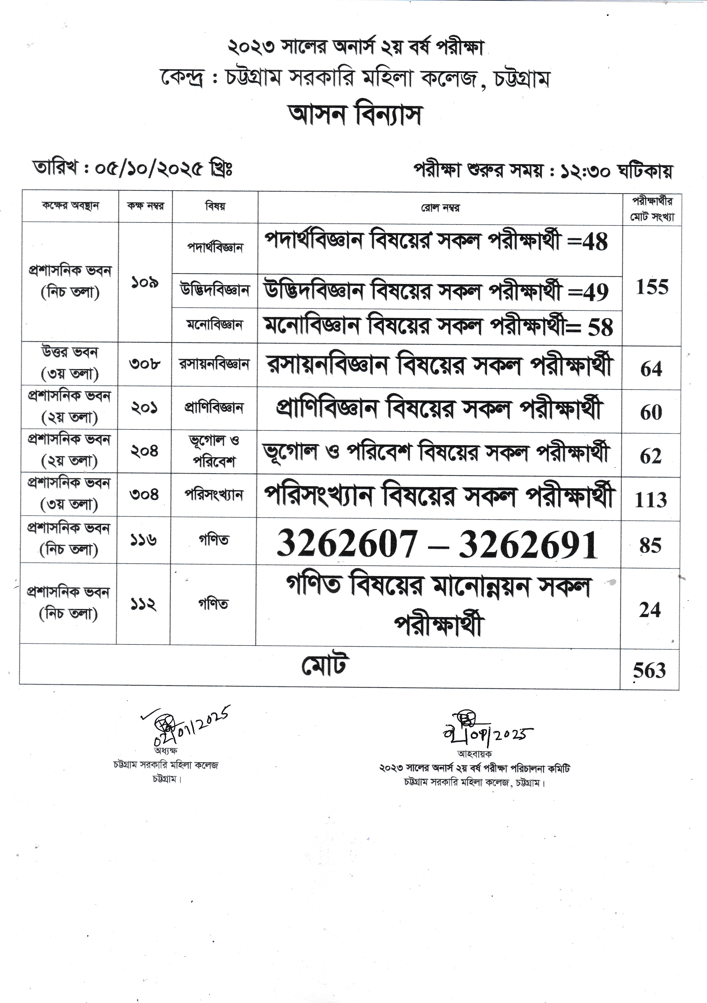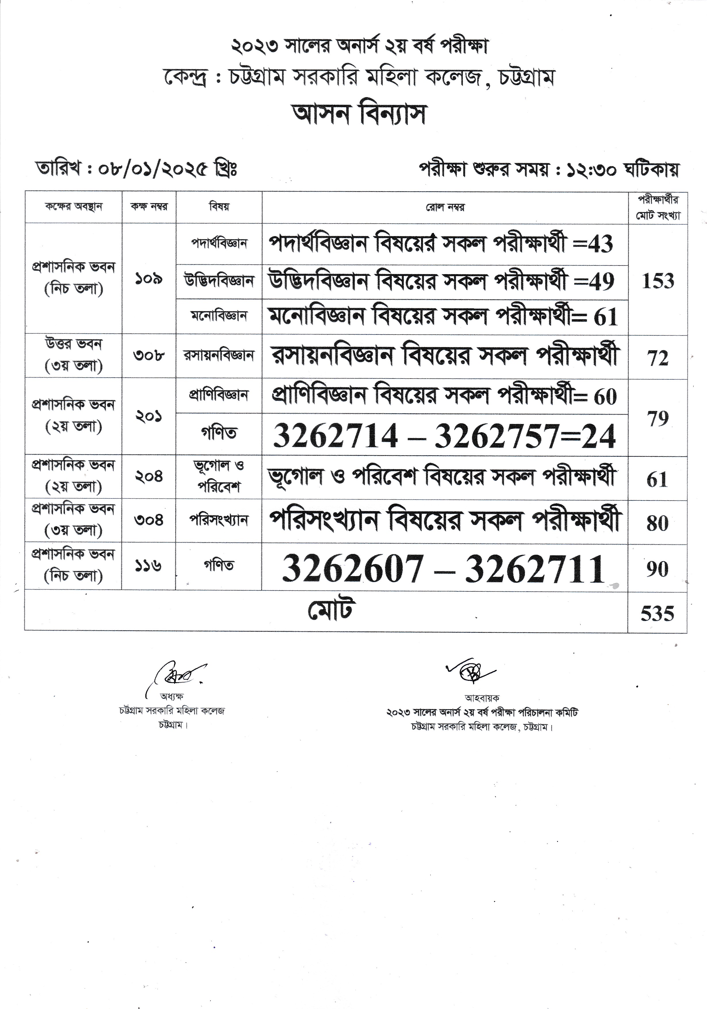 ২০২৩ সালের অনার্স ২য় পরীক্ষার ০৫/০১/২০২৫ তারিখের পরীক্ষার আসন বিন্যাস (০২/০১/২০২৫)
