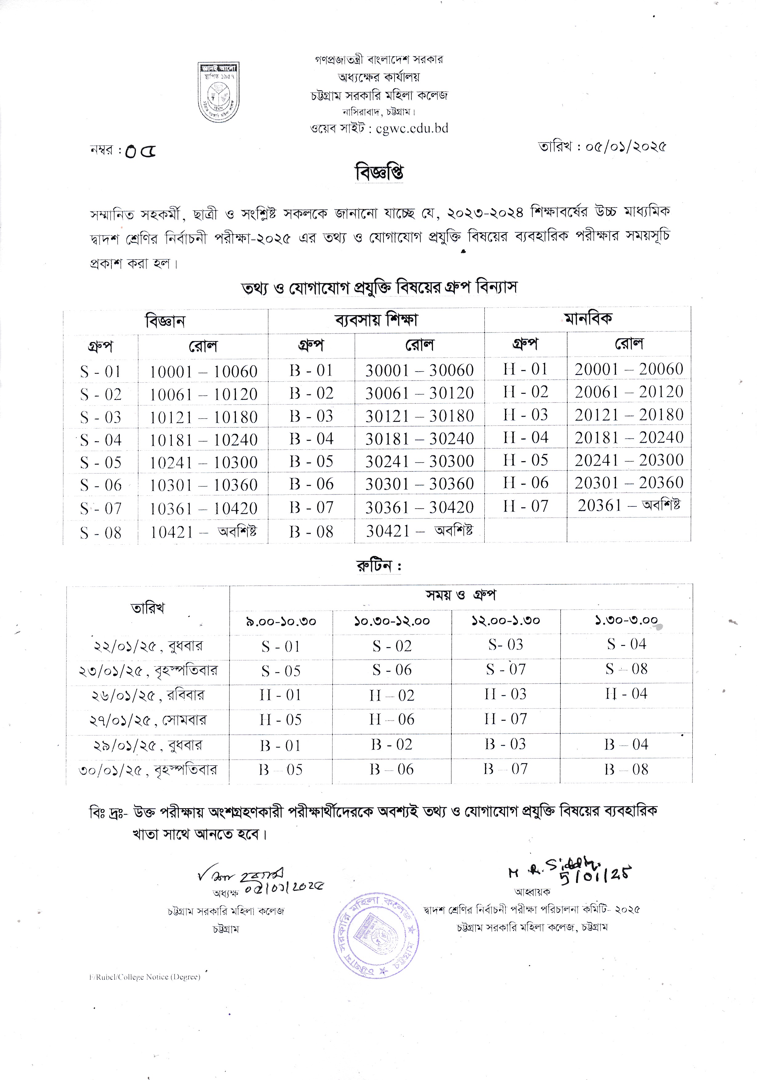 দ্বাদশ শ্রেণির নির্বাচনী পরীক্ষা-২০২৫ এর আইসিটি বিষয়ের ব্যবহারিক পরীক্ষার সময়সূচি প্রকাশ (০৫/০১/২০২৫)
