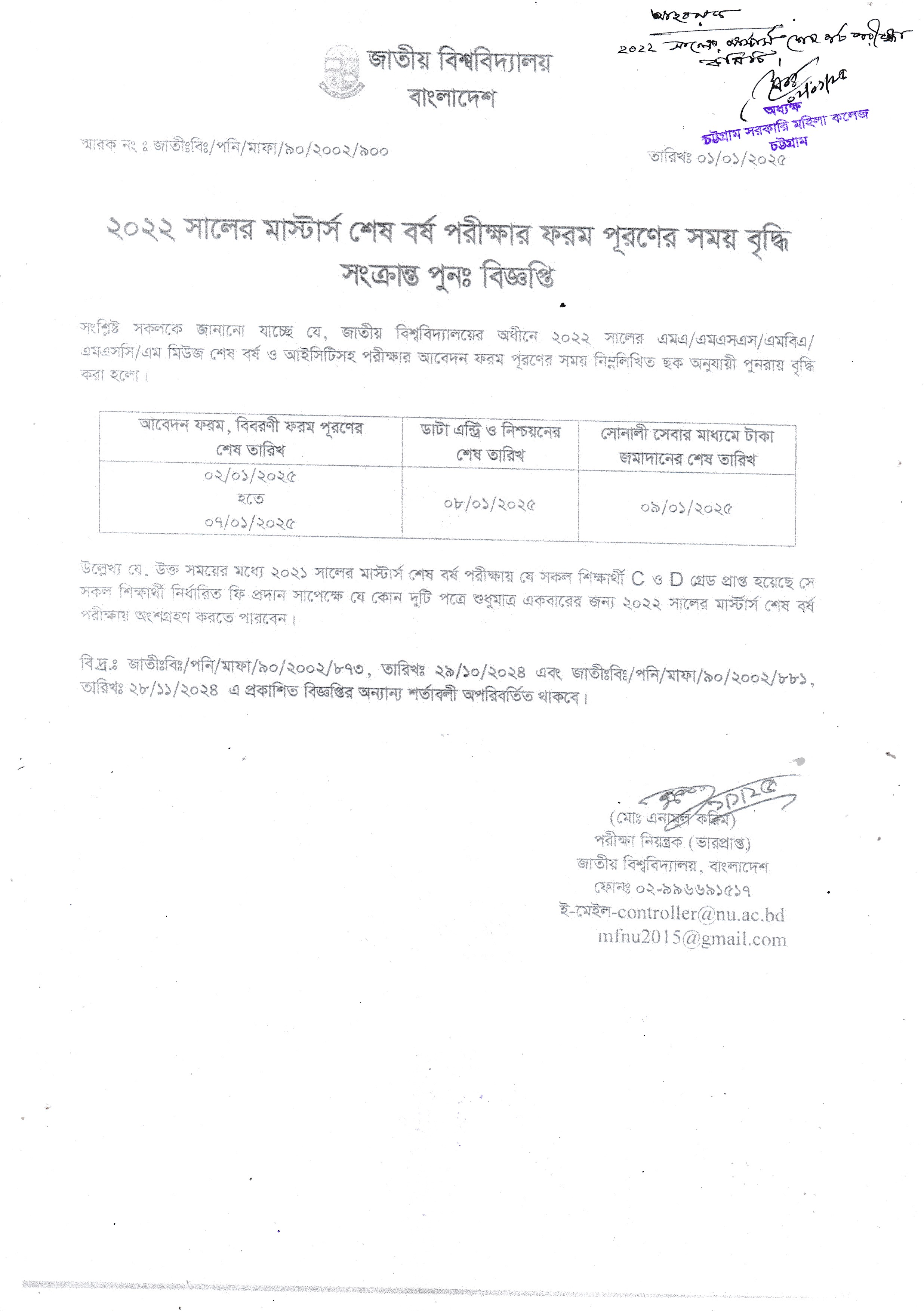 ২০২২ সালের মাস্টার্স শেষপর্ব পরীক্ষার ফরম পূরণের সময় বৃদ্ধি সংক্রান্ত বিজ্ঞপ্তি (০৫/০১/২০২৫)