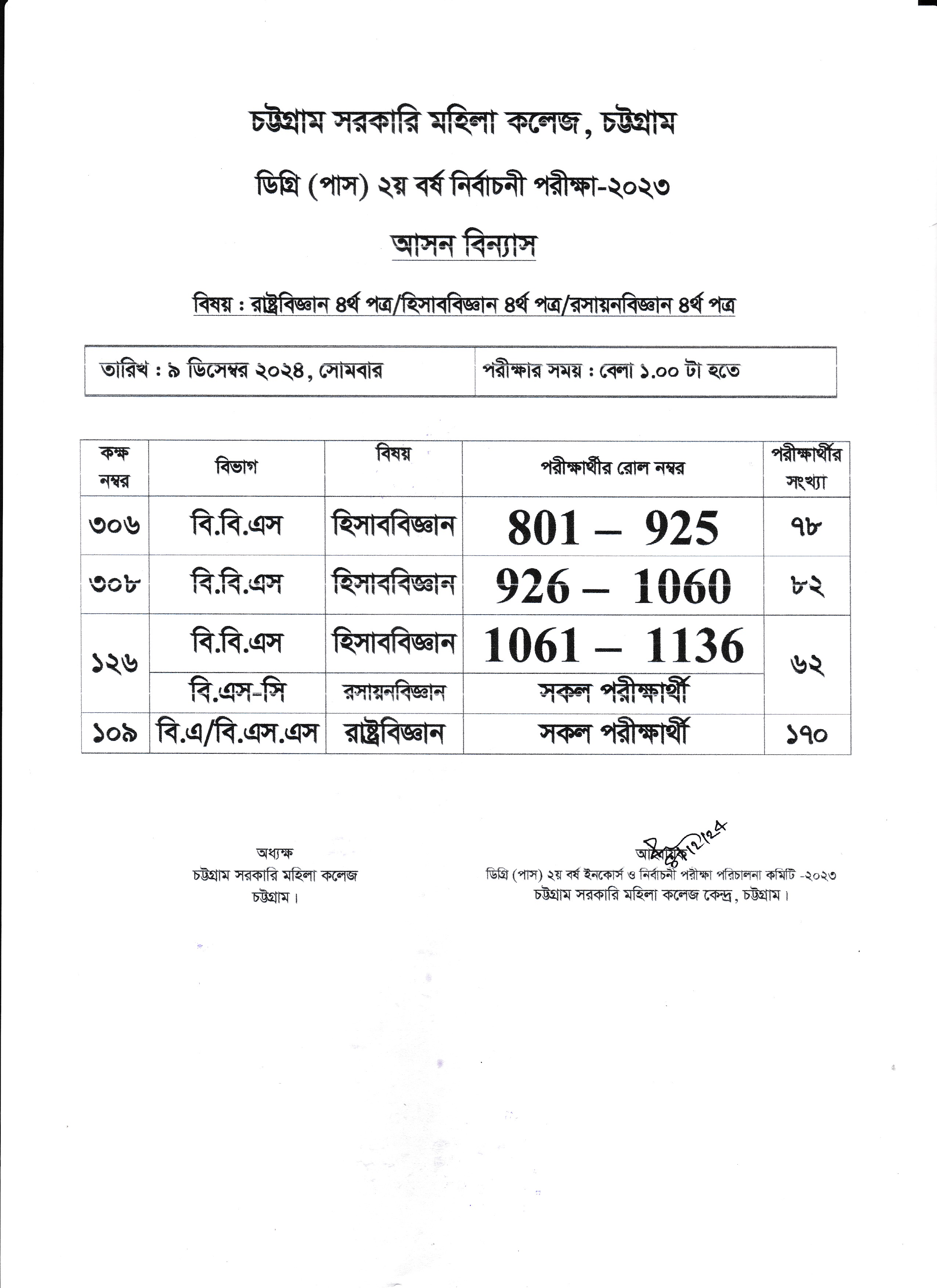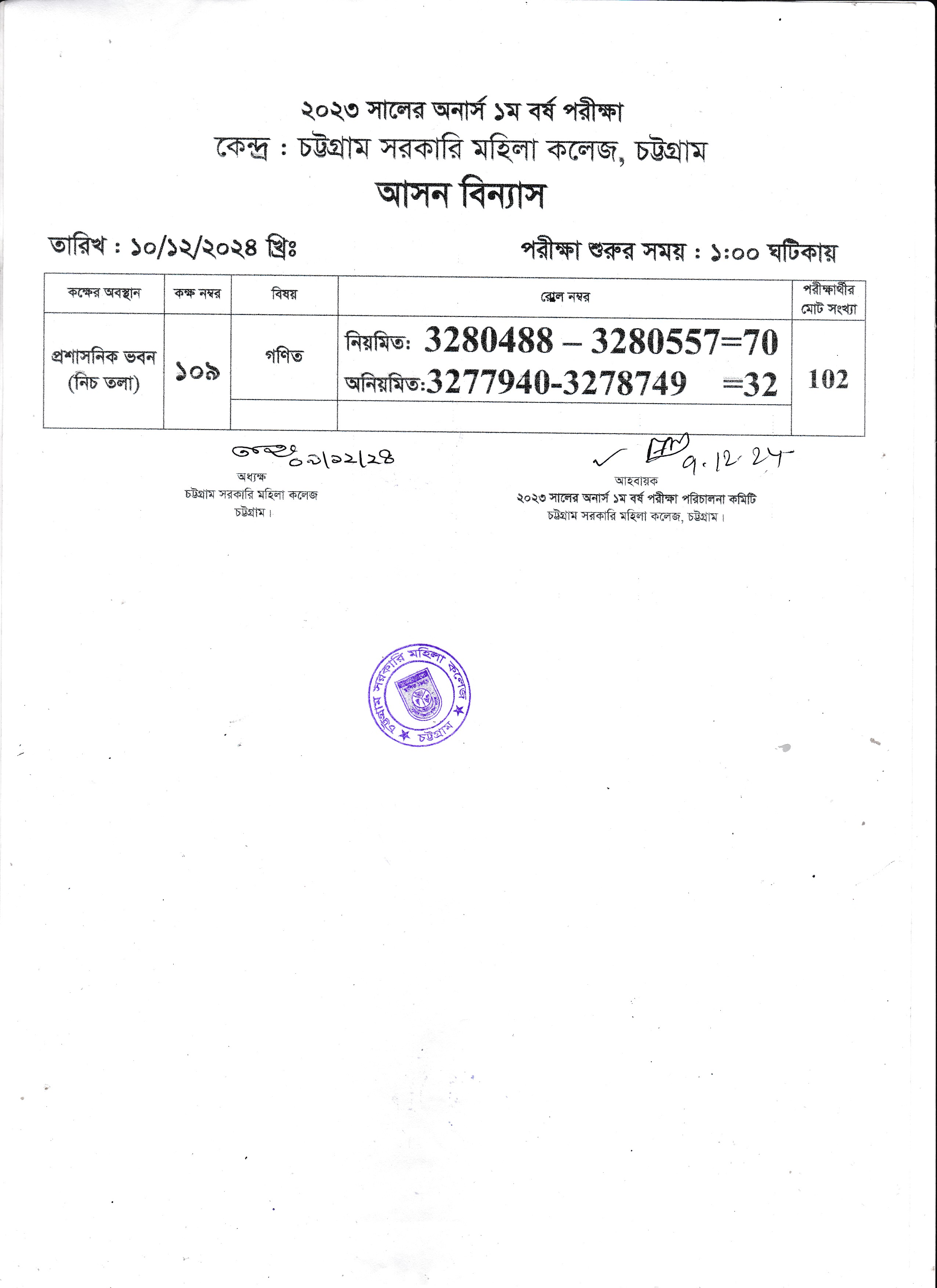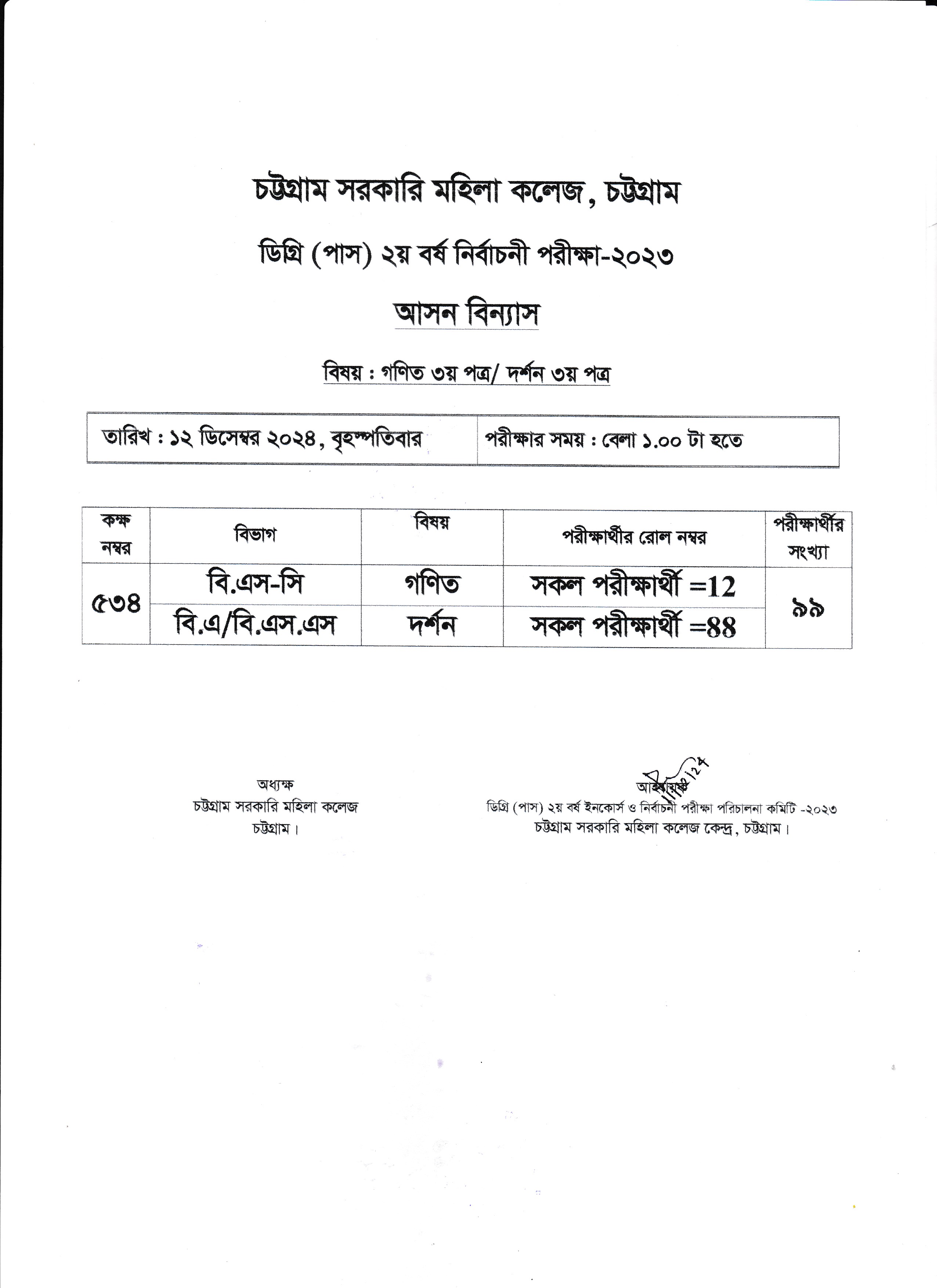২০২৩ সালের অনার্স ১ম বর্ষের ১০/১২/২০২৪ তারিখের পরীক্ষার আসন বিন্যাস
