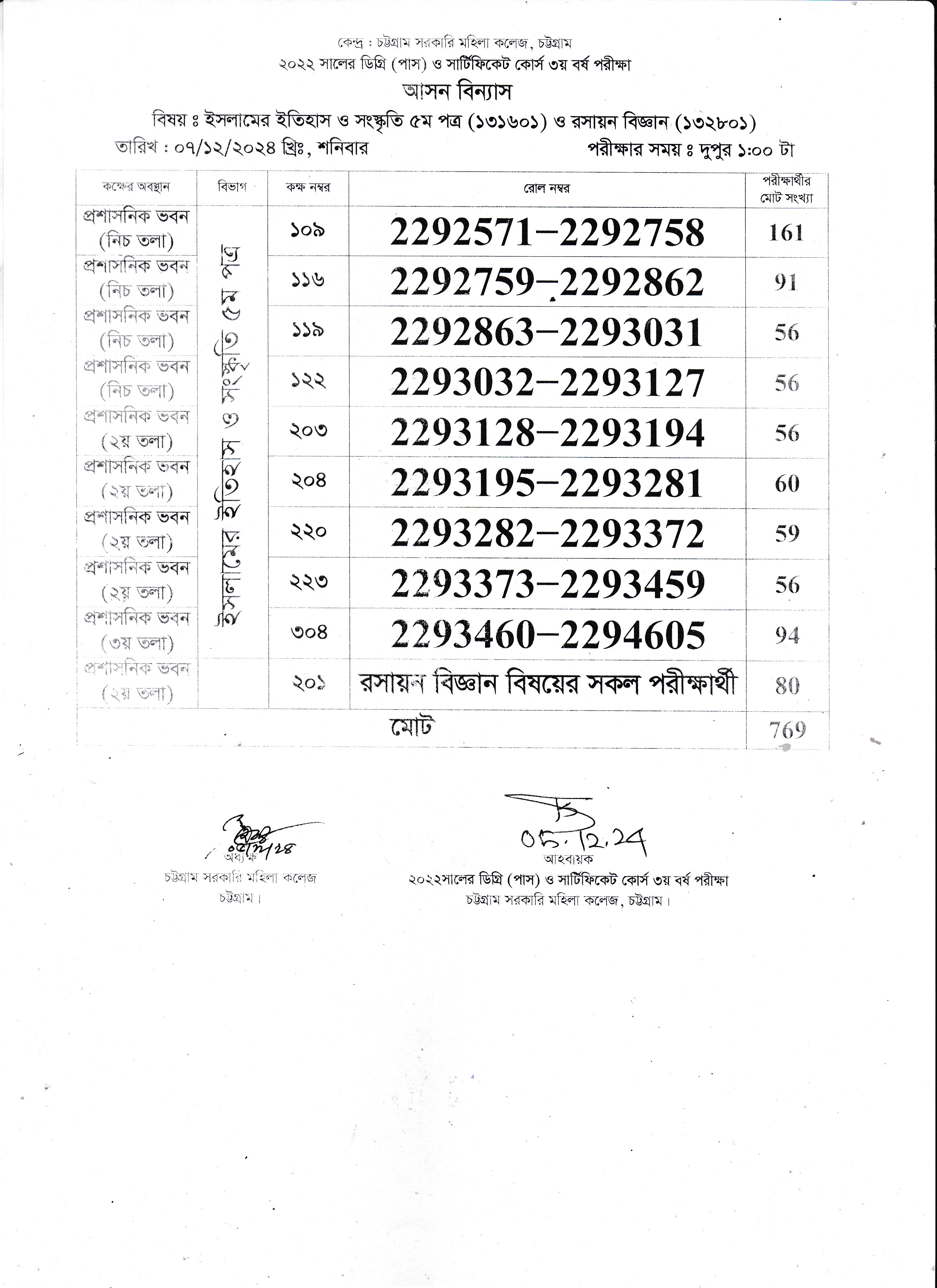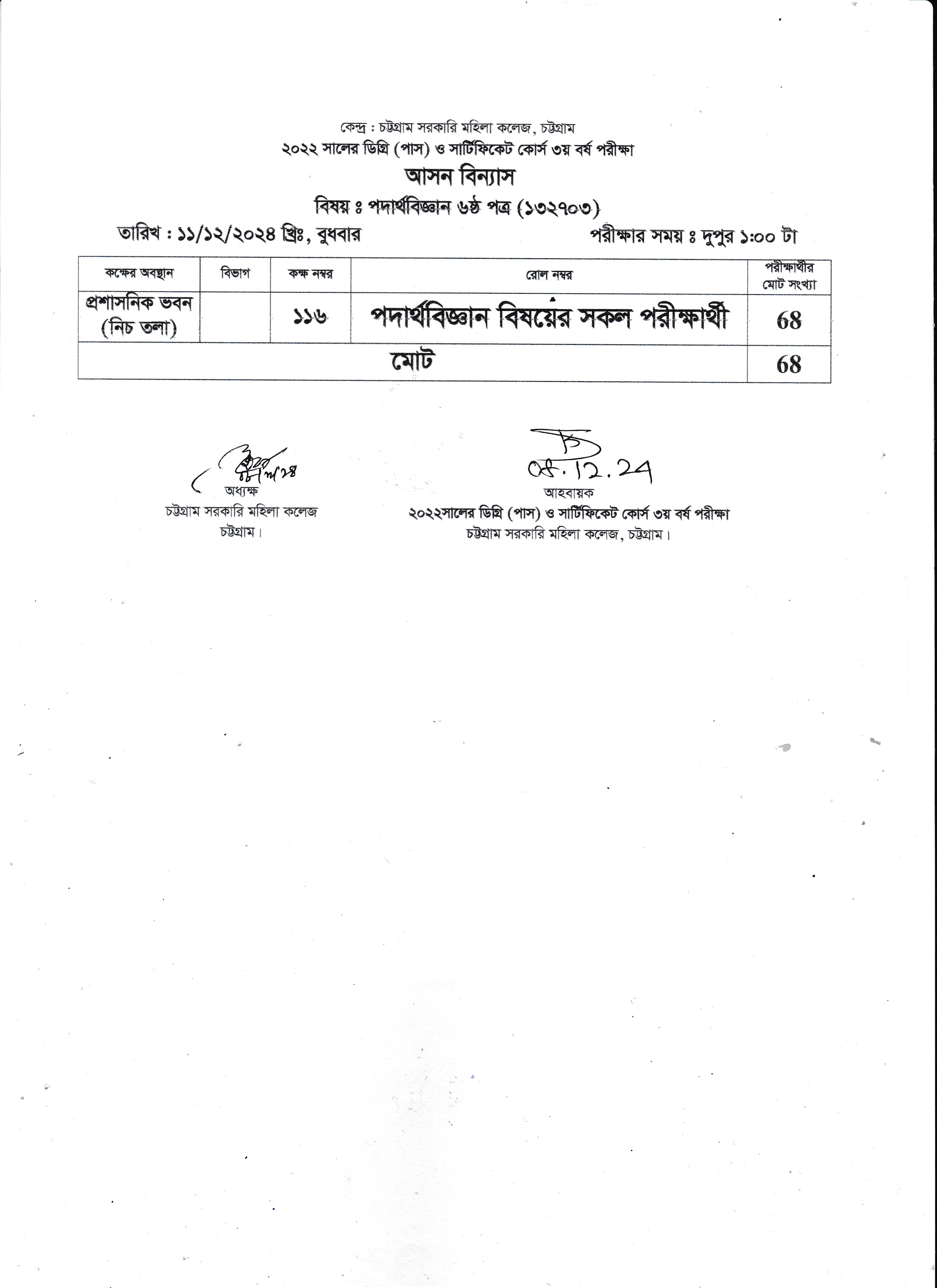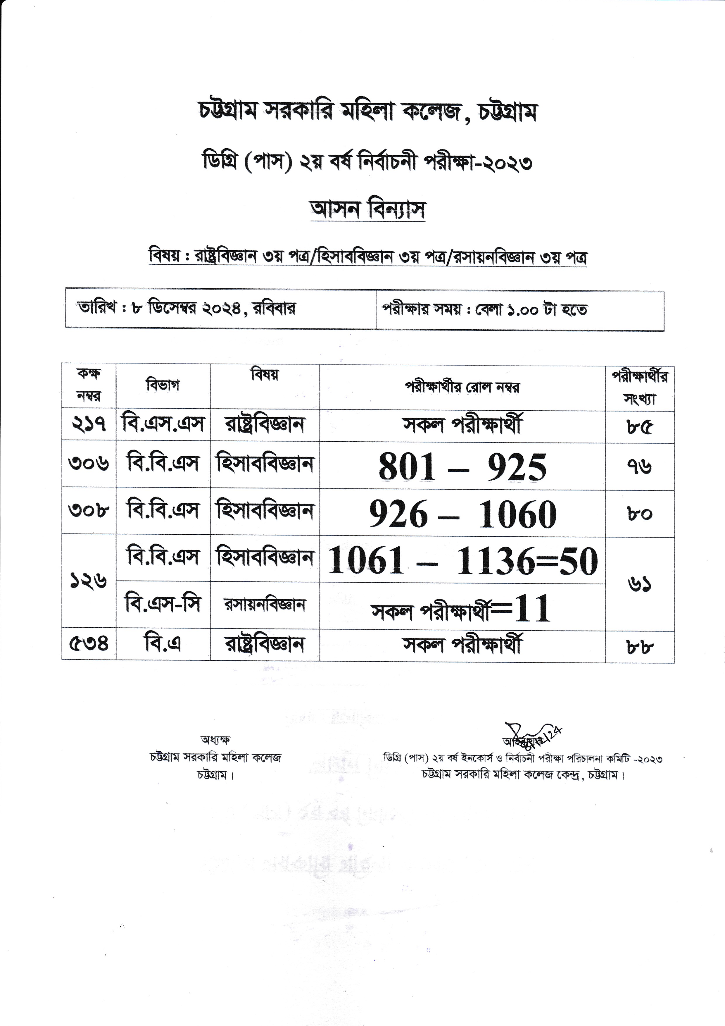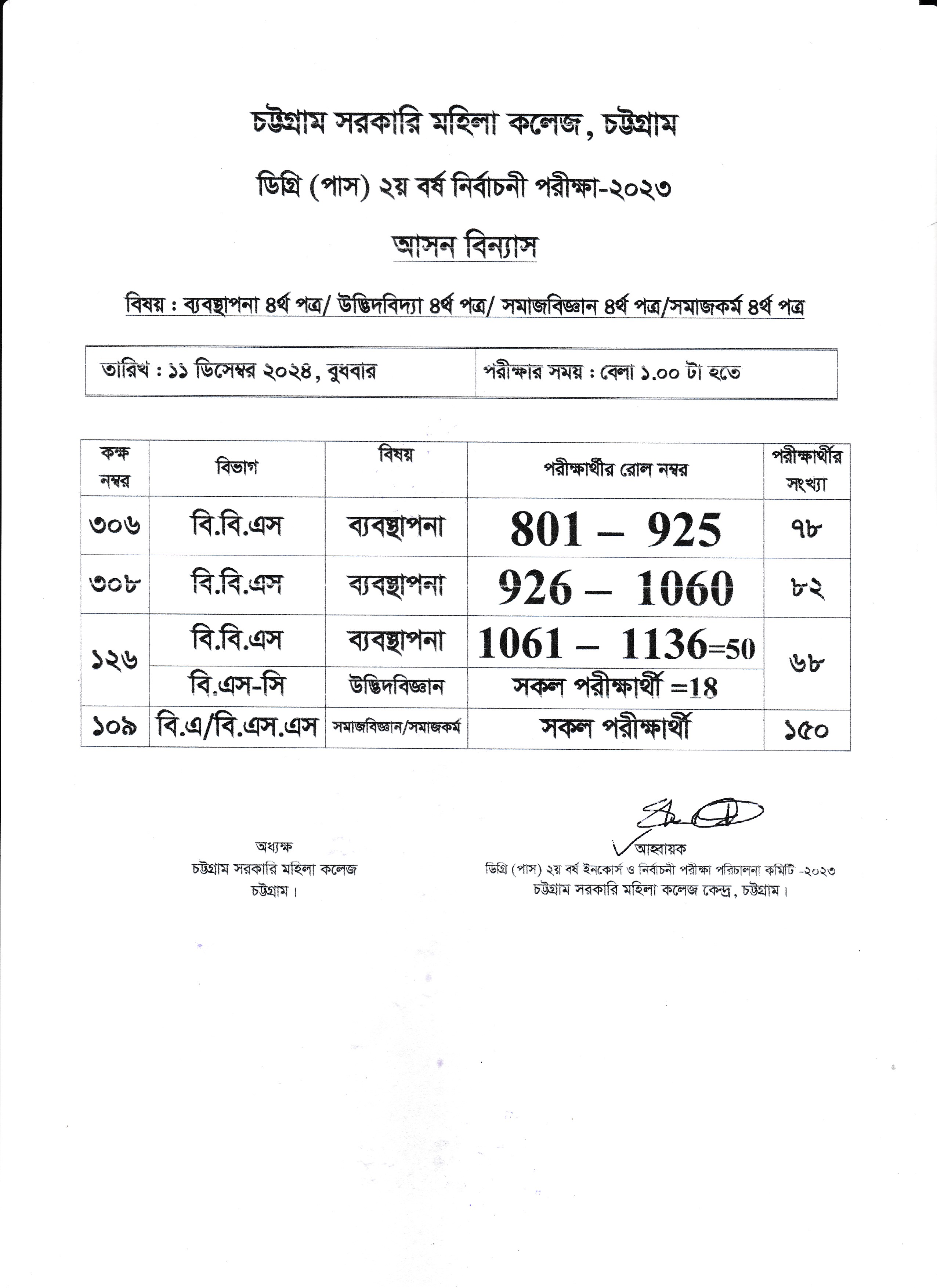 ২০২৩ সালের অনার্স ১ম বর্ষের ১০/১২/২০২৪ তারিখের পরীক্ষার আসন বিন্যাস