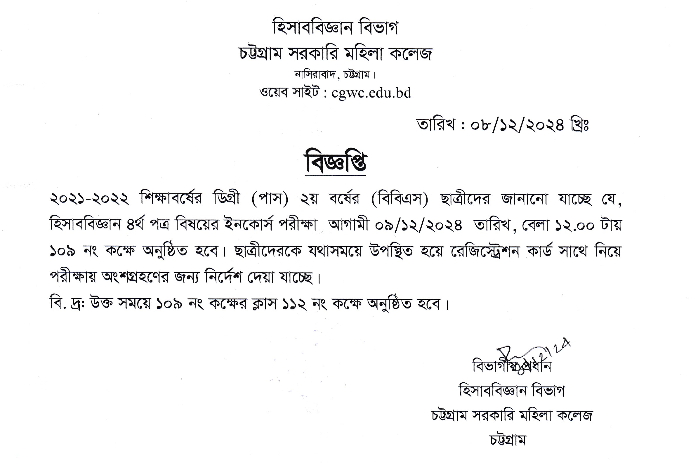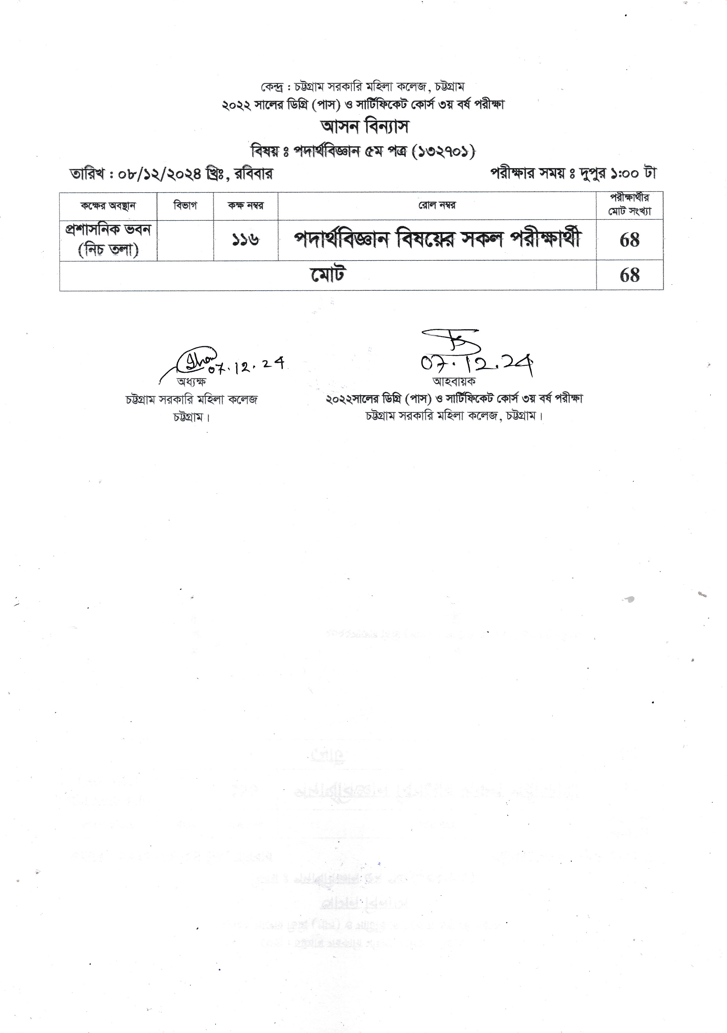 ০৭/১২/২০২৪ তারিখের ডিগ্রি (পাস) ও সার্টিফিকেট কোর্স ৩য় বর্ষ পরীক্ষার আসন বিন্যাস