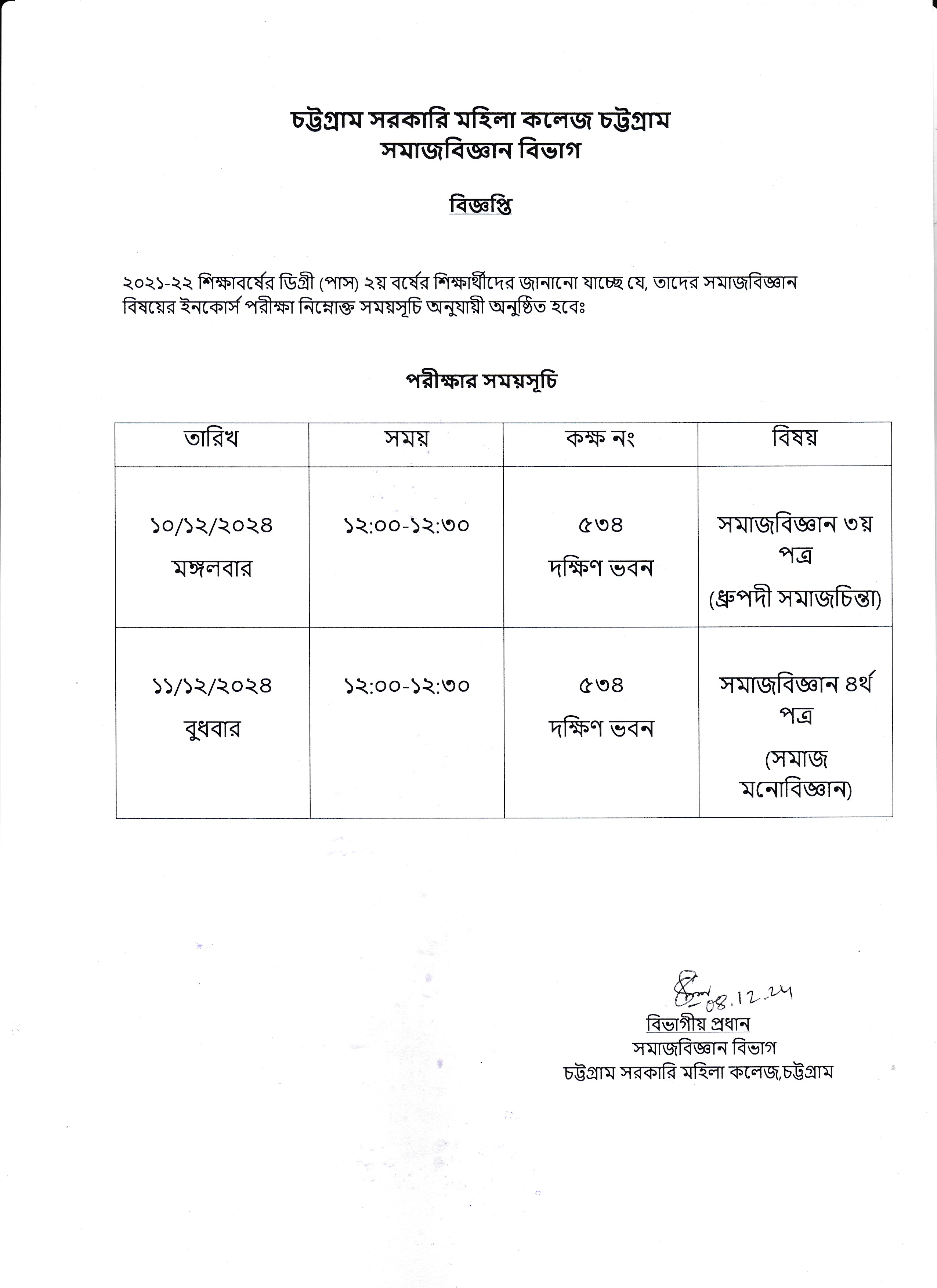 ২০২১-২০২২ শিক্ষাবর্ষের ডিগ্রী (পাস) ২য় বর্ষের সমাজবিজ্ঞান বিষয়ের ইনকোর্স পরীক্ষার সময়সূচি প্রকাশ