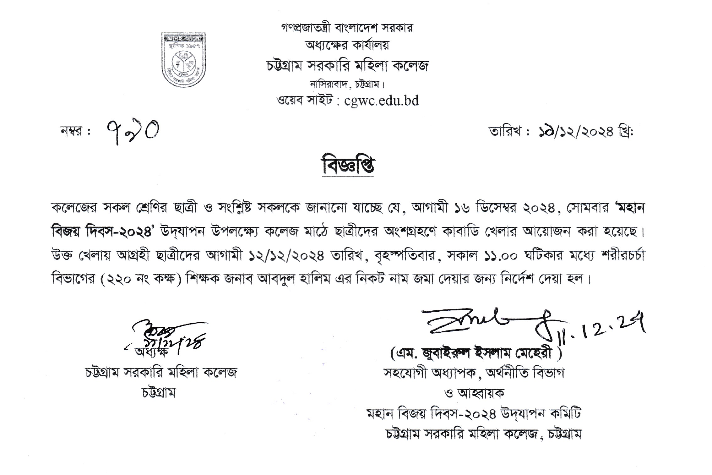 মহান বিজয় দিবস-২০২৪ উপলক্ষ্যে কাবাডি খেলার আয়োজন সংক্রান্ত বিজ্ঞপ্তি