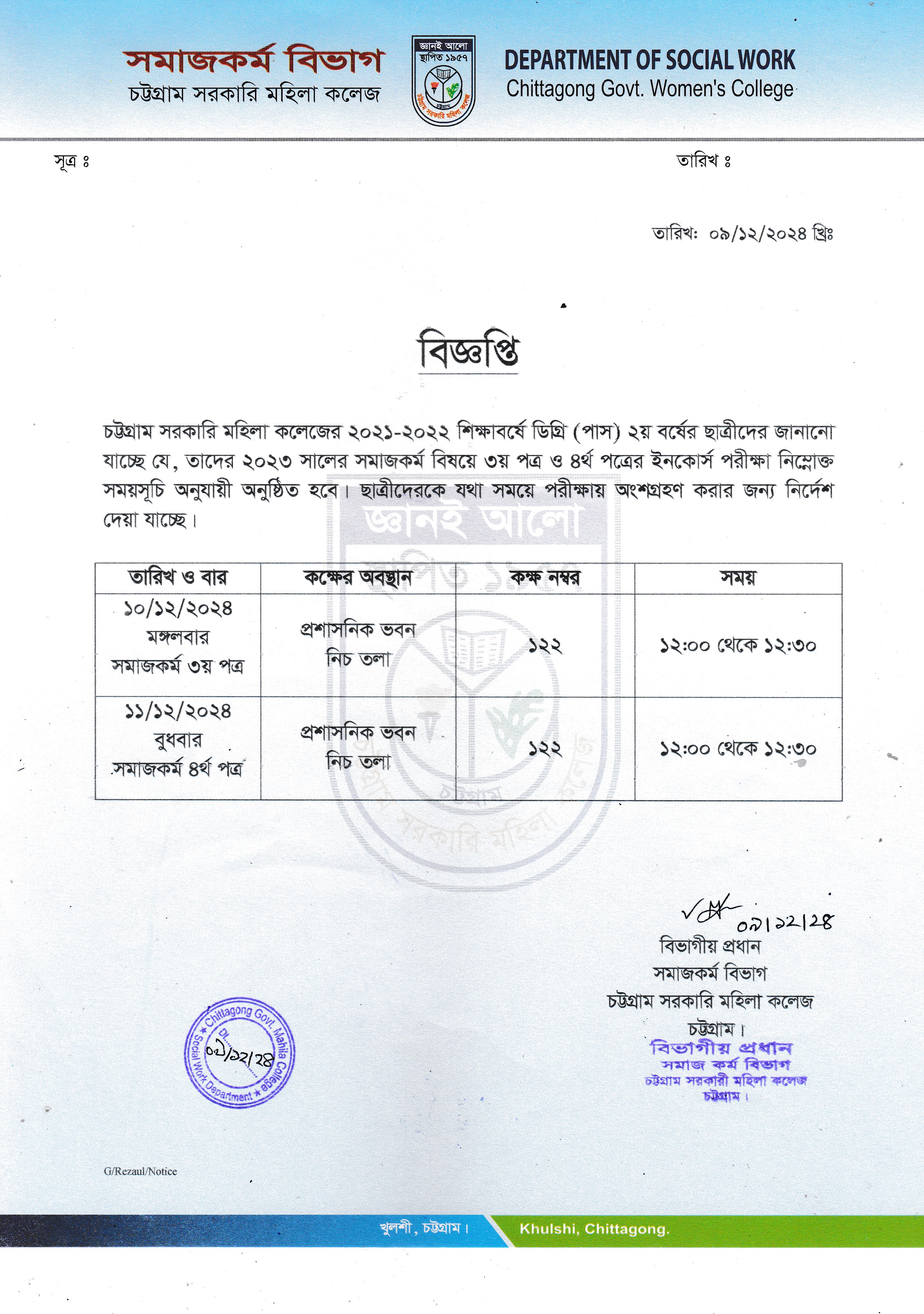 ২০২১-২০২২ শিক্ষাবর্ষে ডিগ্রি (পাস) ২য় বর্ষের সমাজকর্ম বিষয়ের ইনকোর্স পরীক্ষার সময়সূচি প্রকাশ