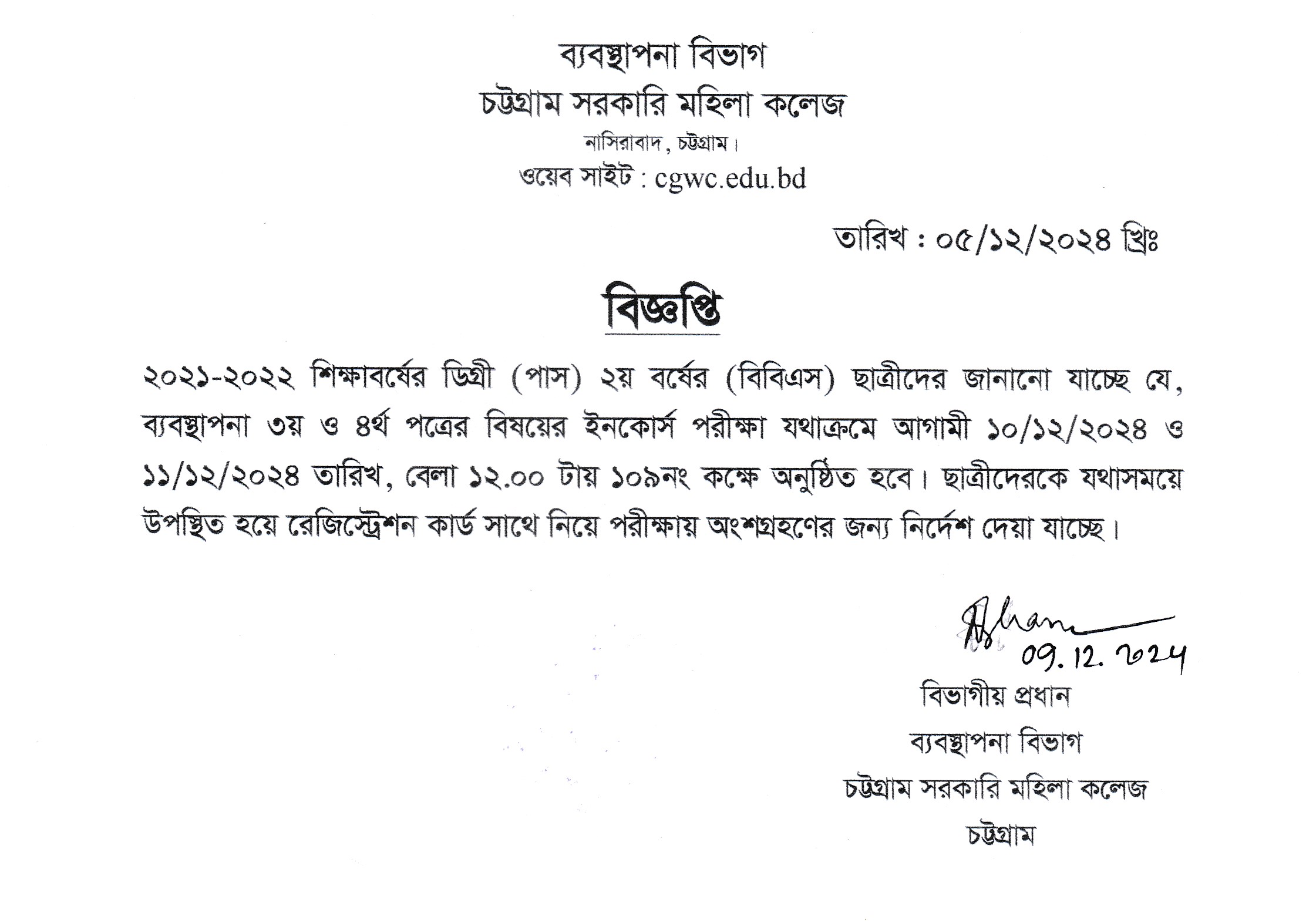 ২০২১-২০২২ শিক্ষাবর্ষে ডিগ্রি (পাস) ২য় বর্ষের ব্যবস্থাপনা ৩য় ও ৪র্থ পত্র বিষয়ের ইনকোর্স পরীক্ষার সময়সূচি প্রকাশ