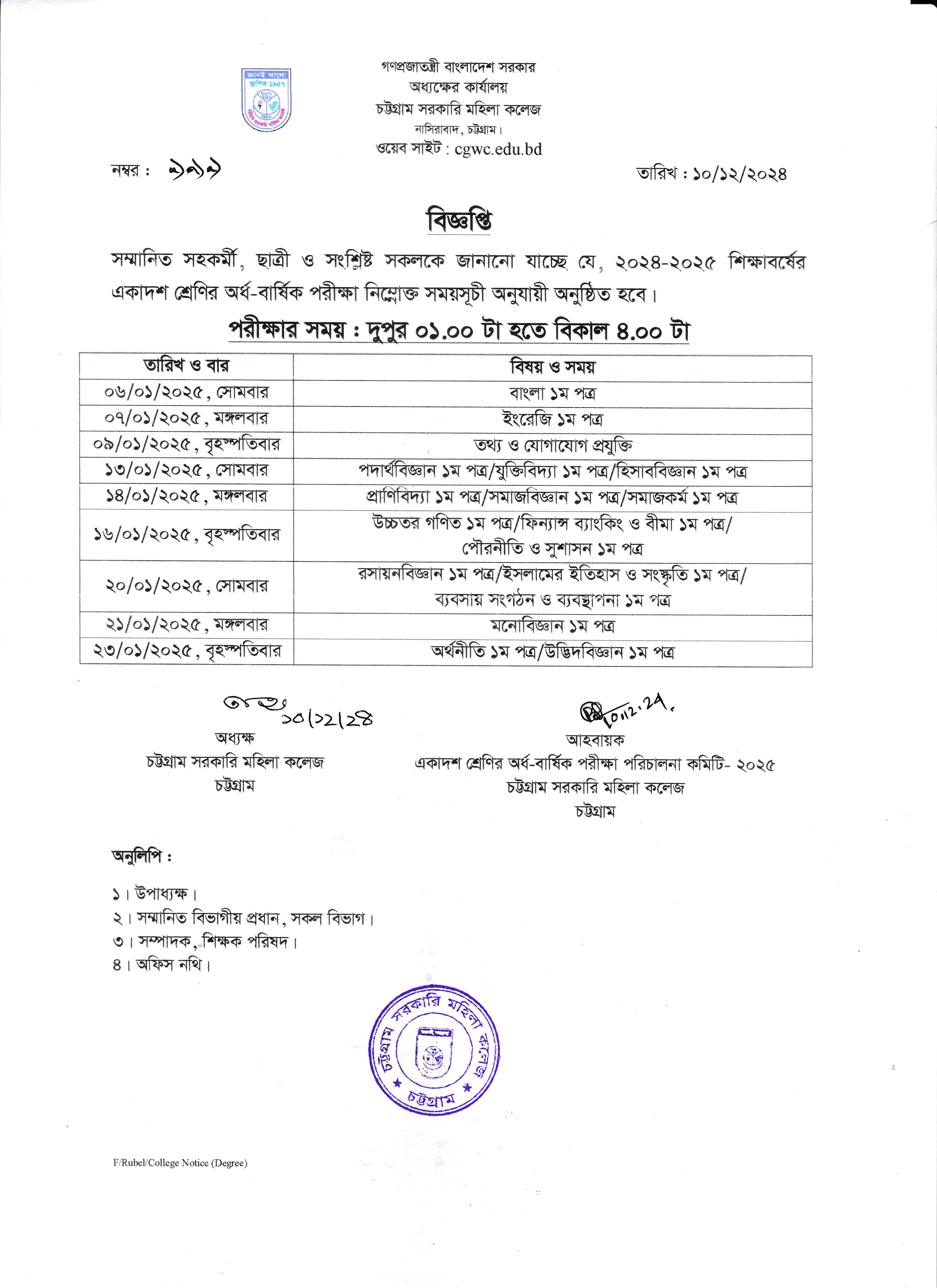 ২০২৪-২০২৫ শিক্ষাবর্ষের একাদশ শ্রেণির অর্ধ-বার্ষিক পরীক্ষা সময়সূচি প্রকাশ