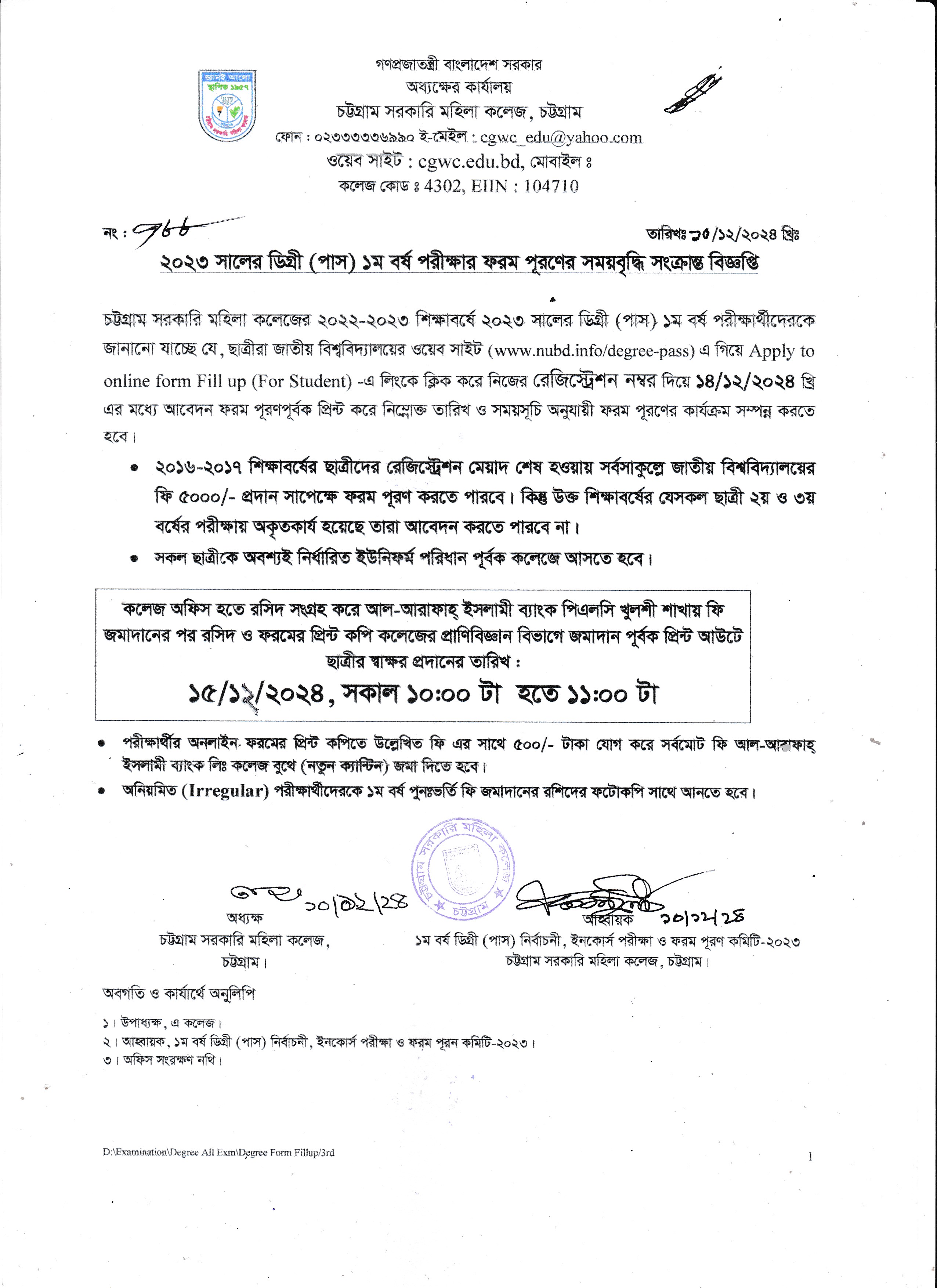 ২০২৩ সালের ডিগ্রি (পাস) ১ম বর্ষের ফরম পূরণের সময় বৃদ্ধি সংক্রান্ত বিজ্ঞপ্তি