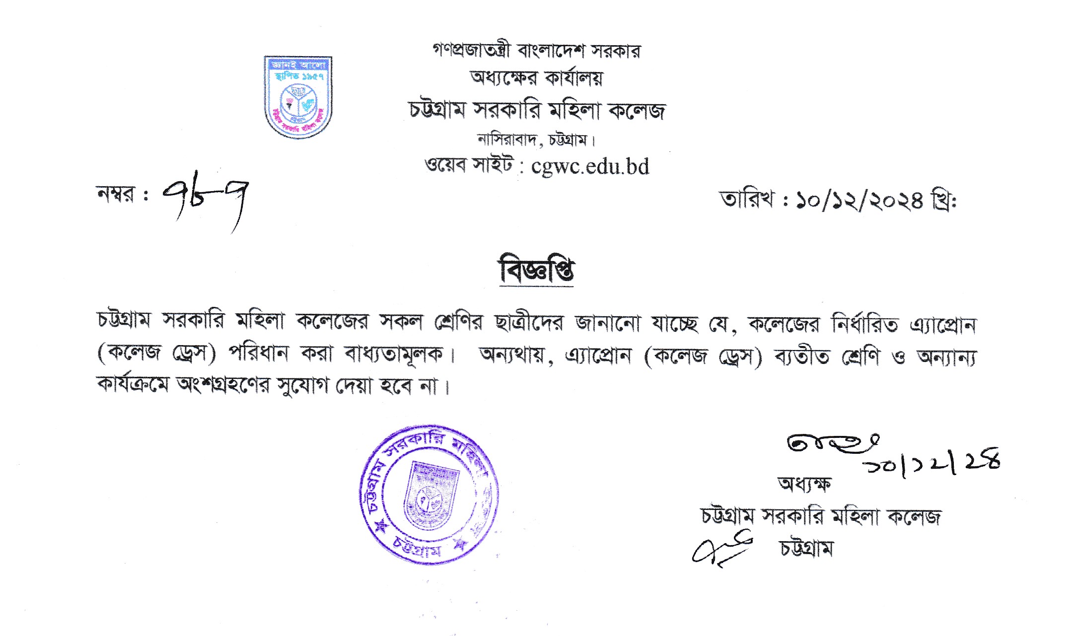 কলেজের নির্ধারিত এ্যাপ্রোন (কলেজ ড্রেস) পরিধান সংক্রান্ত বিজ্ঞপ্তি
