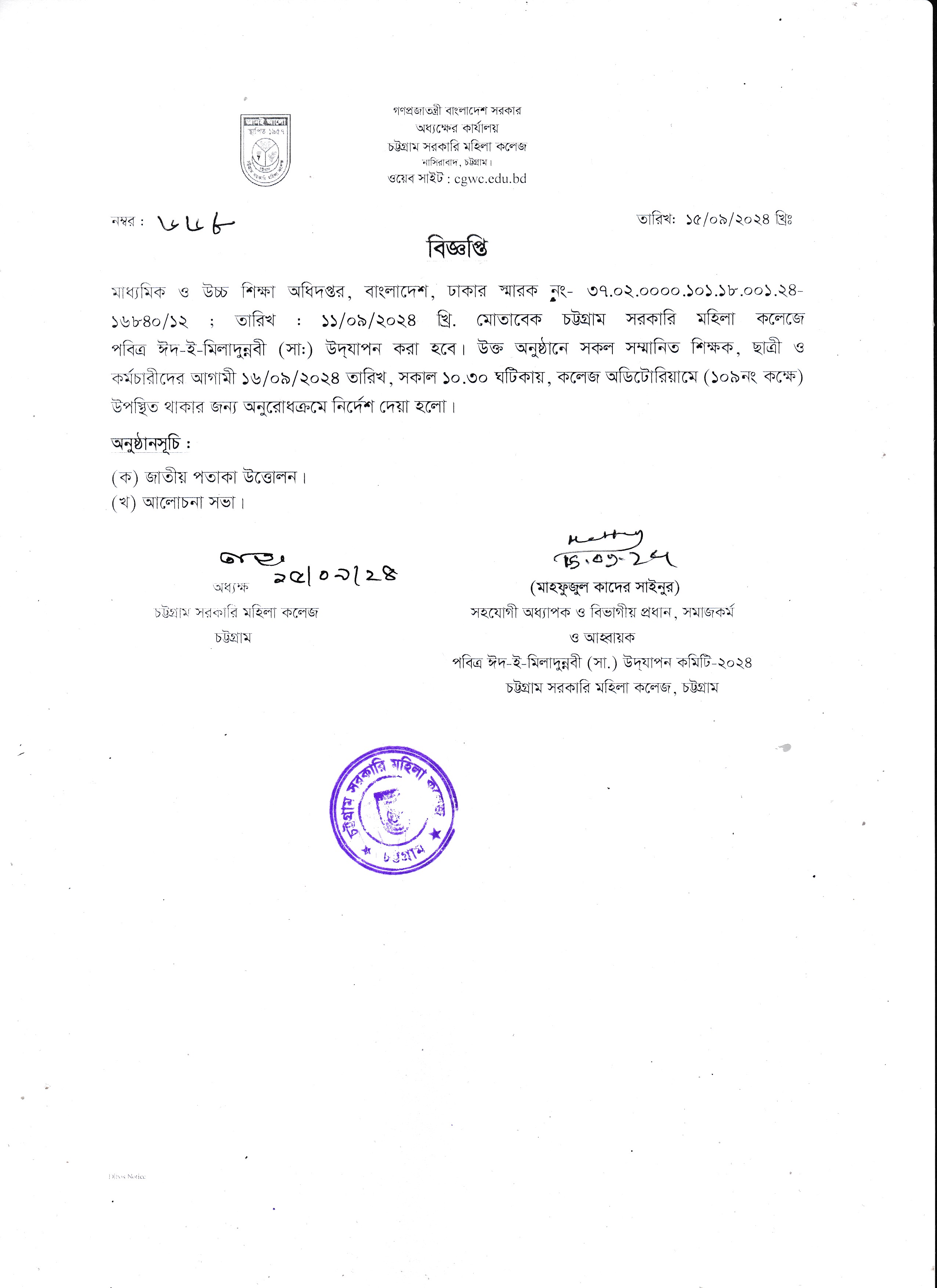 পবিত্র ঈদ-ই-মিলাদুন্নবী (সাঃ) উপলক্ষে উপস্থিতি থাকার বিজ্ঞপ্তি (১৫/০৯/২০২৪)