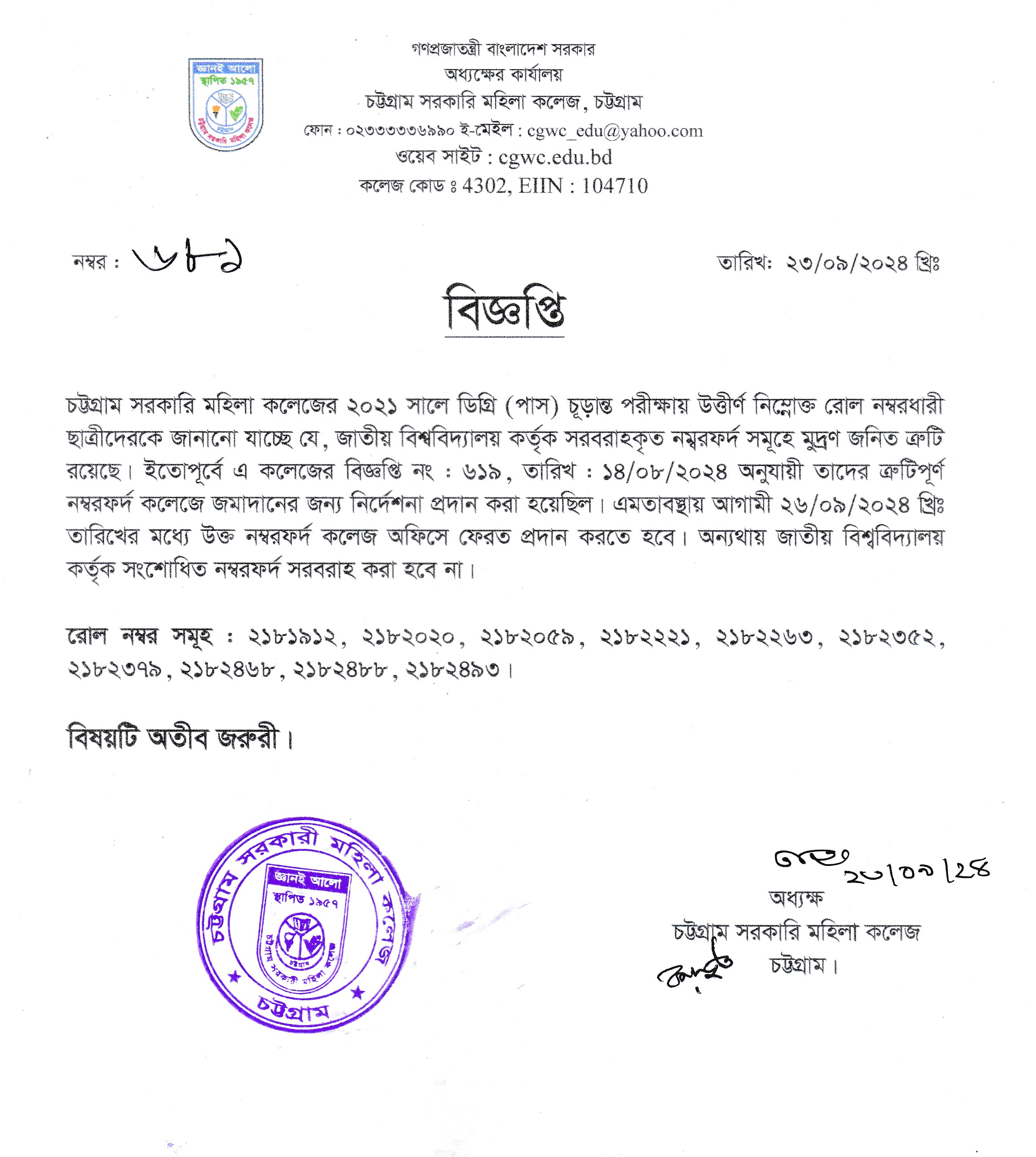 ২০২১ সালের ডিগ্রী (পাস) চূড়ান্ত পরীক্ষায় উত্তীর্ণ ছাত্রীদের ভুল নম্বরফর্দ জমাদান সংক্রান্ত বিজ্ঞপ্তি