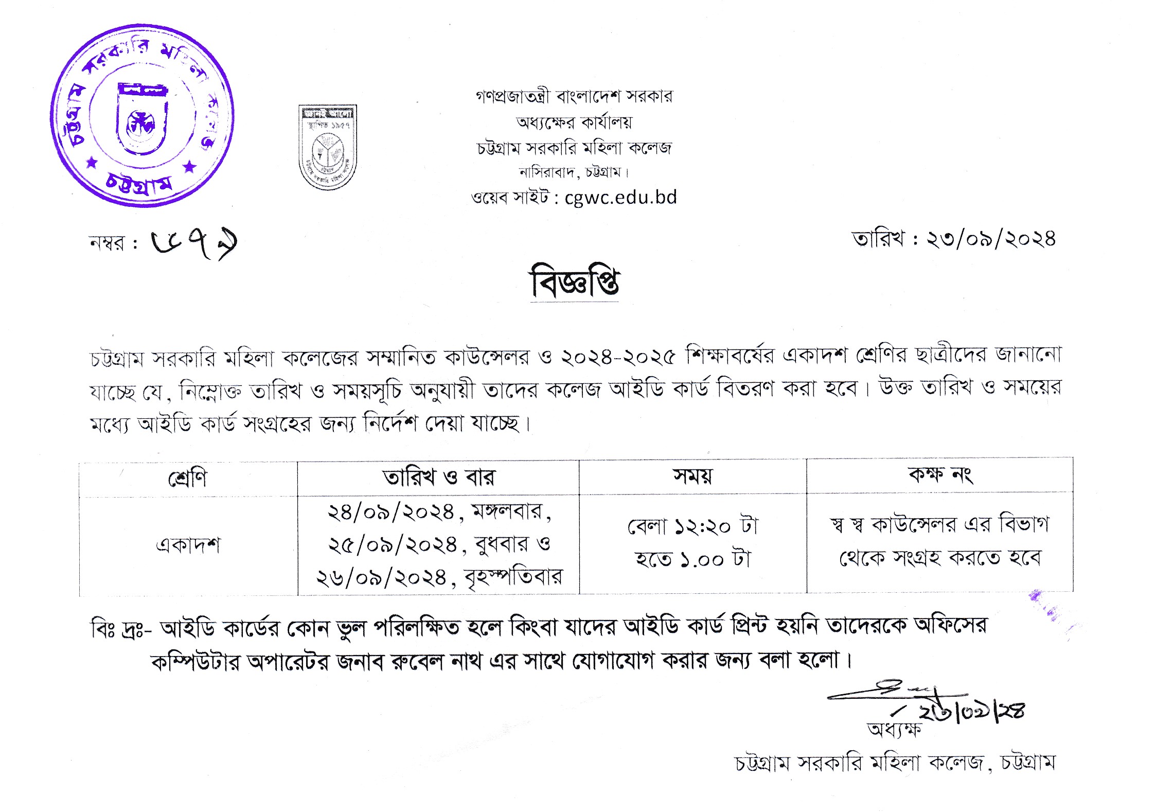 কলেজের একাদশ শ্রেণির ছাত্রীদের আইডি কার্ড বিতরণ সংক্রান্ত বিজ্ঞপ্তি