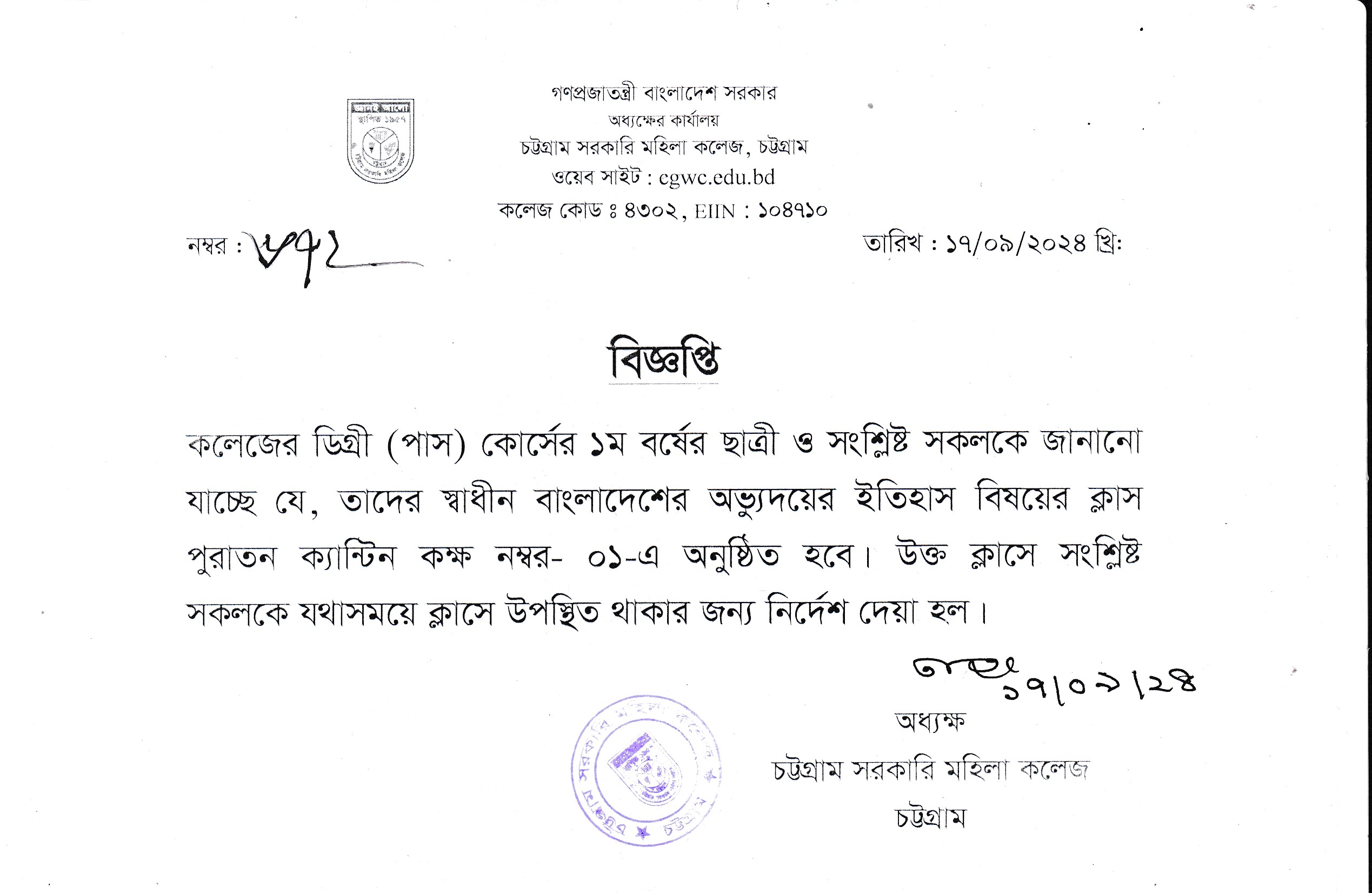 ডিগ্রি (পাস) ১ম বর্ষের স্বাধীন বাংলাদেশের অভ্যুদয়ের ইতিহাস বিষয়ের ক্লাস সম্পর্কিত বিজ্ঞপ্তি (১৭/০৯/২০২৪)