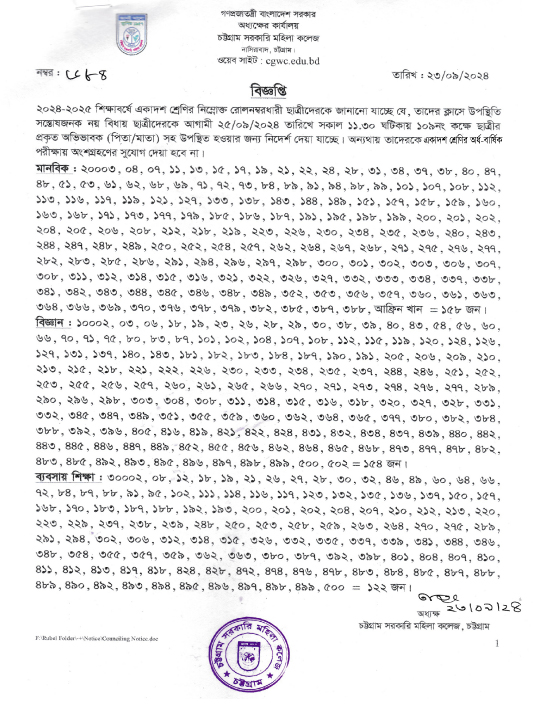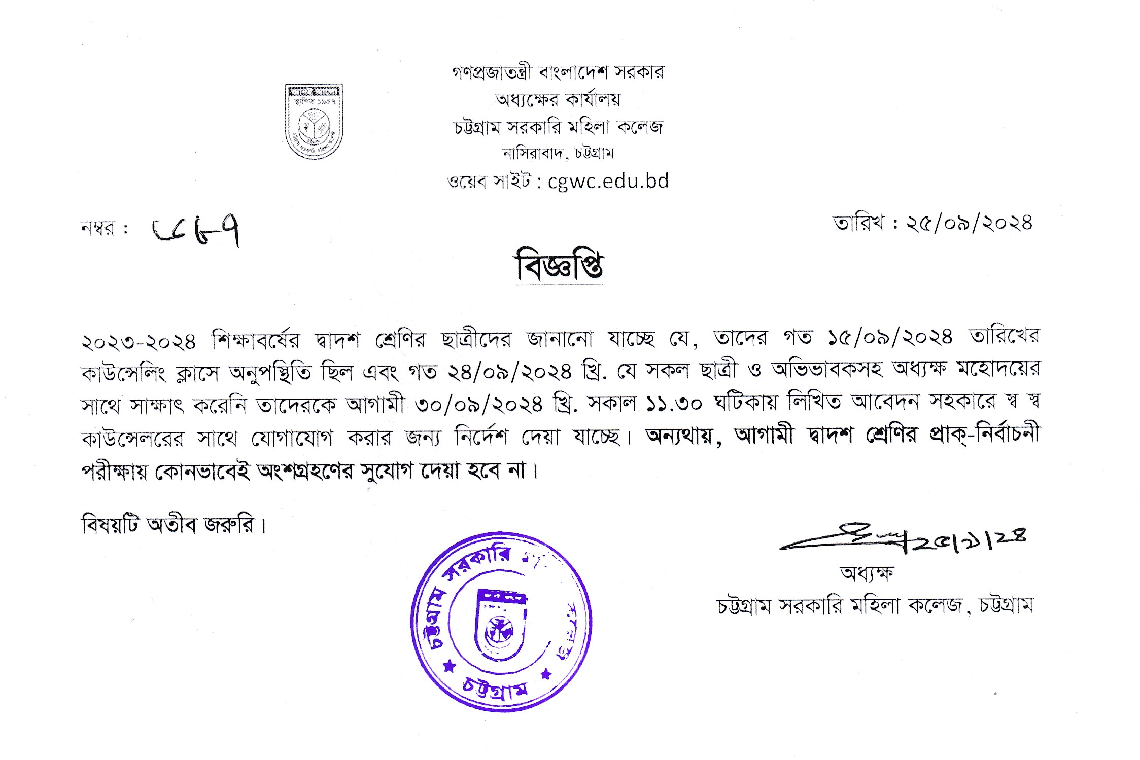 ২০২৩-২০২৪ শিক্ষাবর্ষের দ্বাদশ শ্রেণির গত কাউন্সেলিং ও অভিভাবকসহ সাক্ষাৎকারে উপস্থিত না থাকা প্রসঙ্গে।