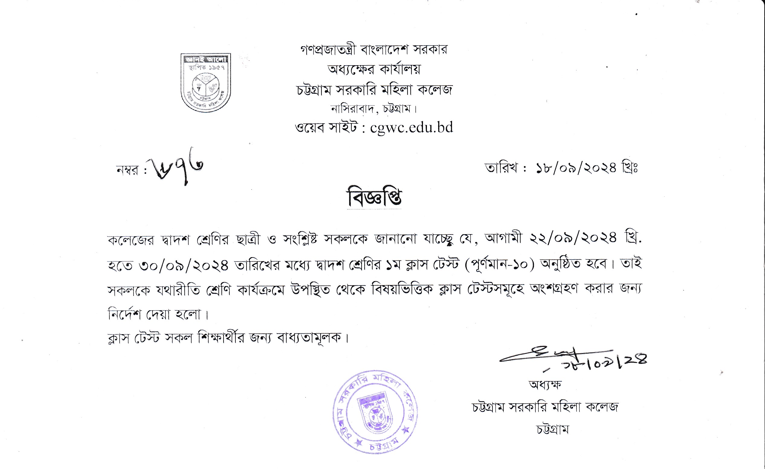 দ্বাদশ শ্রেনির ক্লাস টেস্ট সংক্রান্ত বিজ্ঞ্প্তি (১৮/০৯/২০২৪)