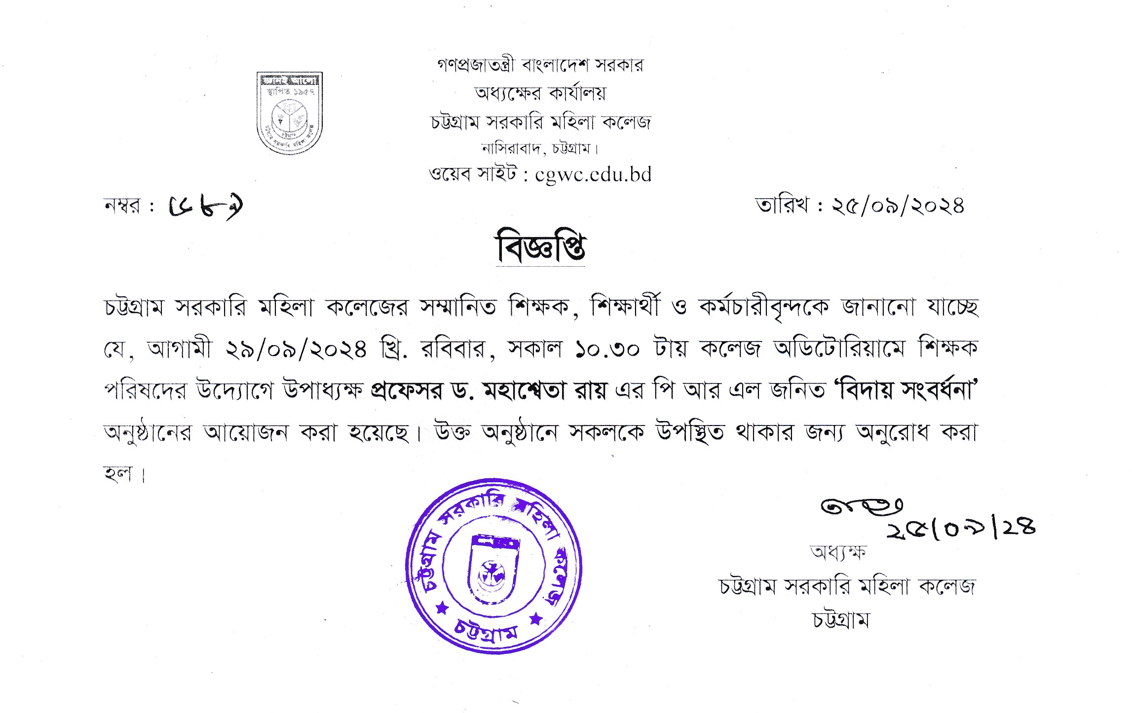 আগামী ২৯/০৯/২০২৪ তারিখে উপাধ্যক্ষ প্রফেসর ড. মহাশ্বেতা রায় এর বিদায় সংবর্ধনা অনুষ্ঠান আয়োজন সংক্রান্ত বিজ্ঞপ্তি