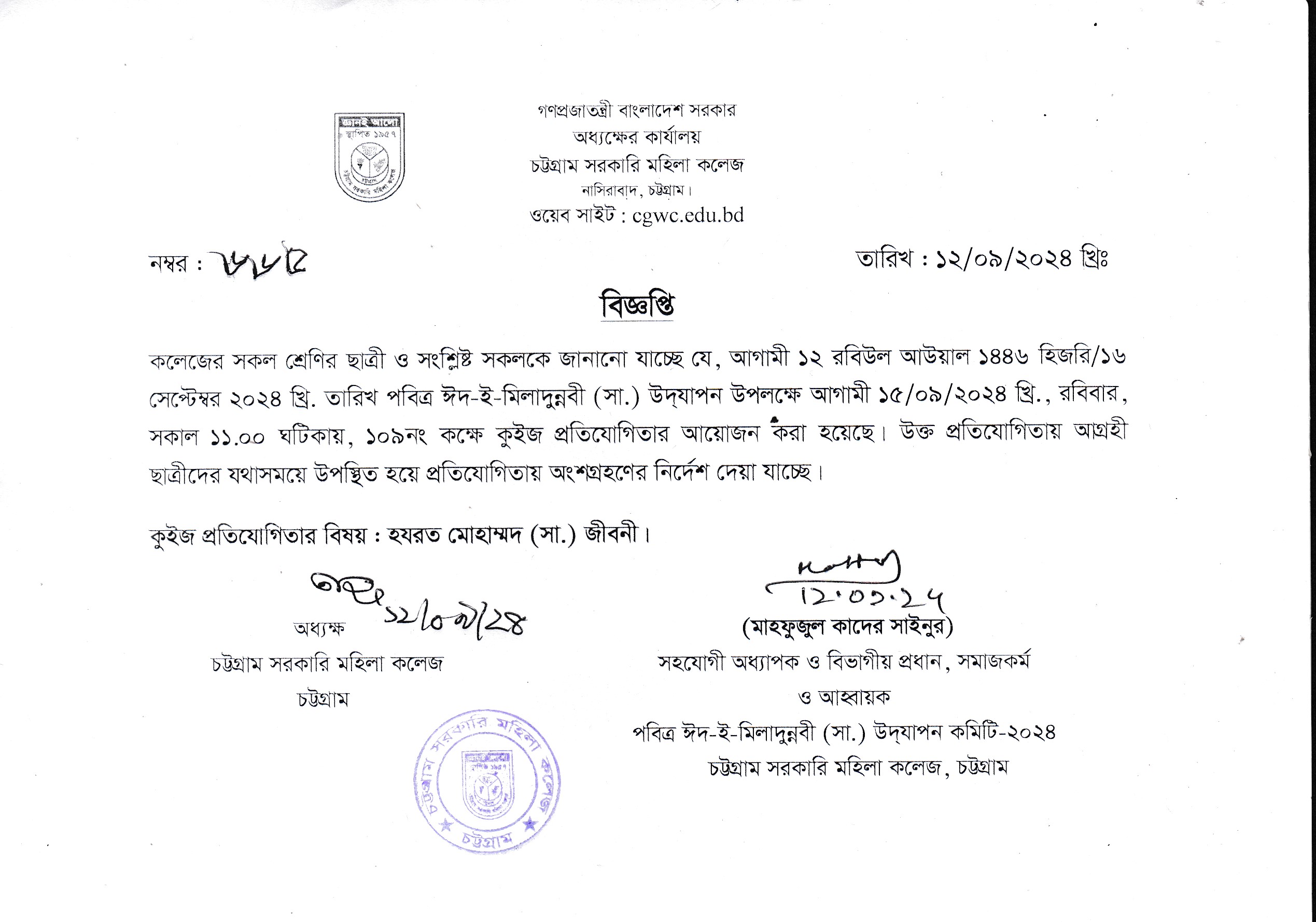 পবিত্র ঈদ-ই-মিলাদুন্নবী (সাঃ) উপলক্ষে কুইজ প্রতিযোগিতার বিজ্ঞপ্তি (১২/০৯/২০২৪)