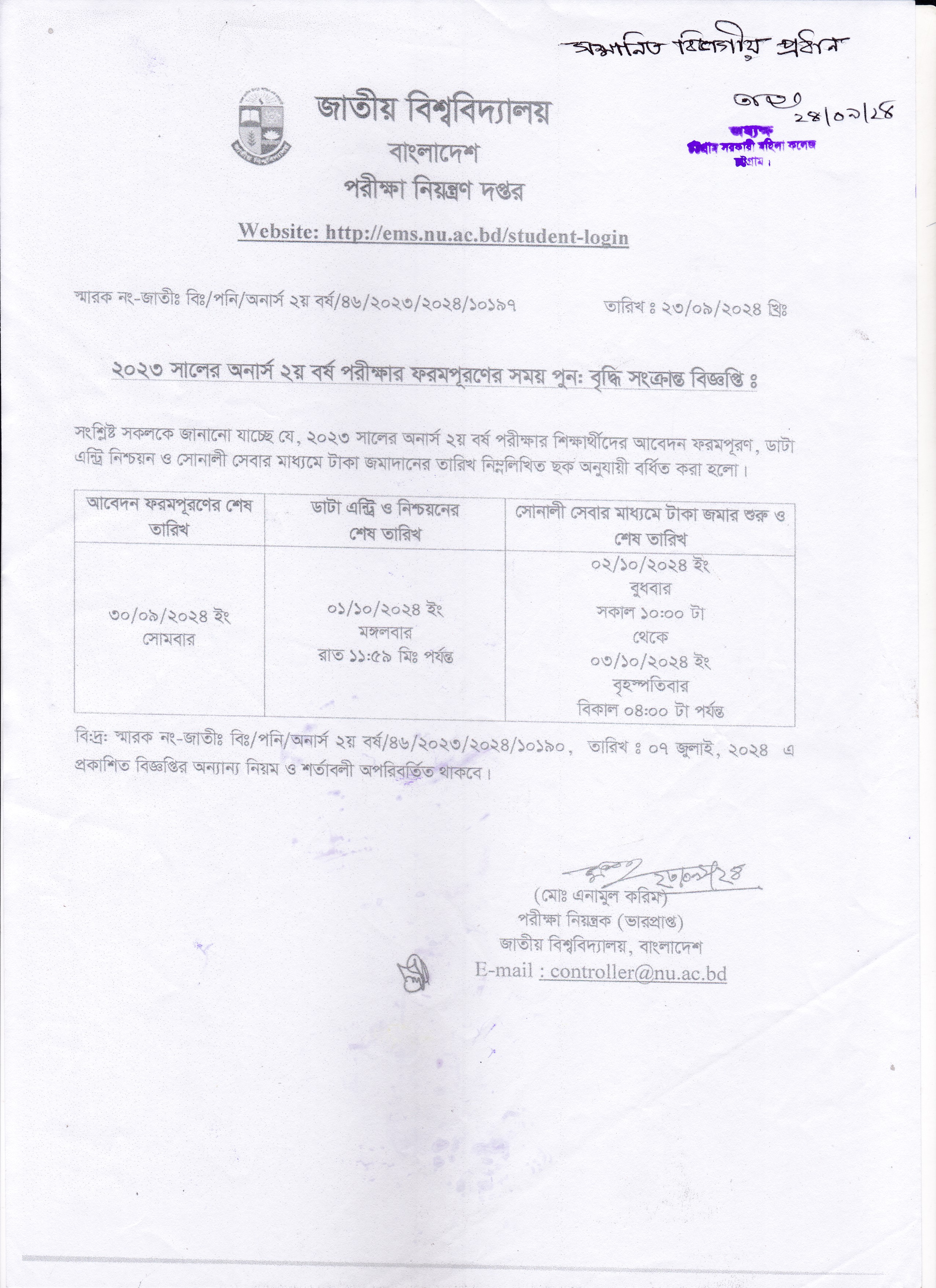 ২০২৩ সালের অনার্স ২য় বর্ষ পরীক্ষার ফরম পূরণের সময় পুনবৃদ্ধি সংক্রান্ত বিজ্ঞপ্তি