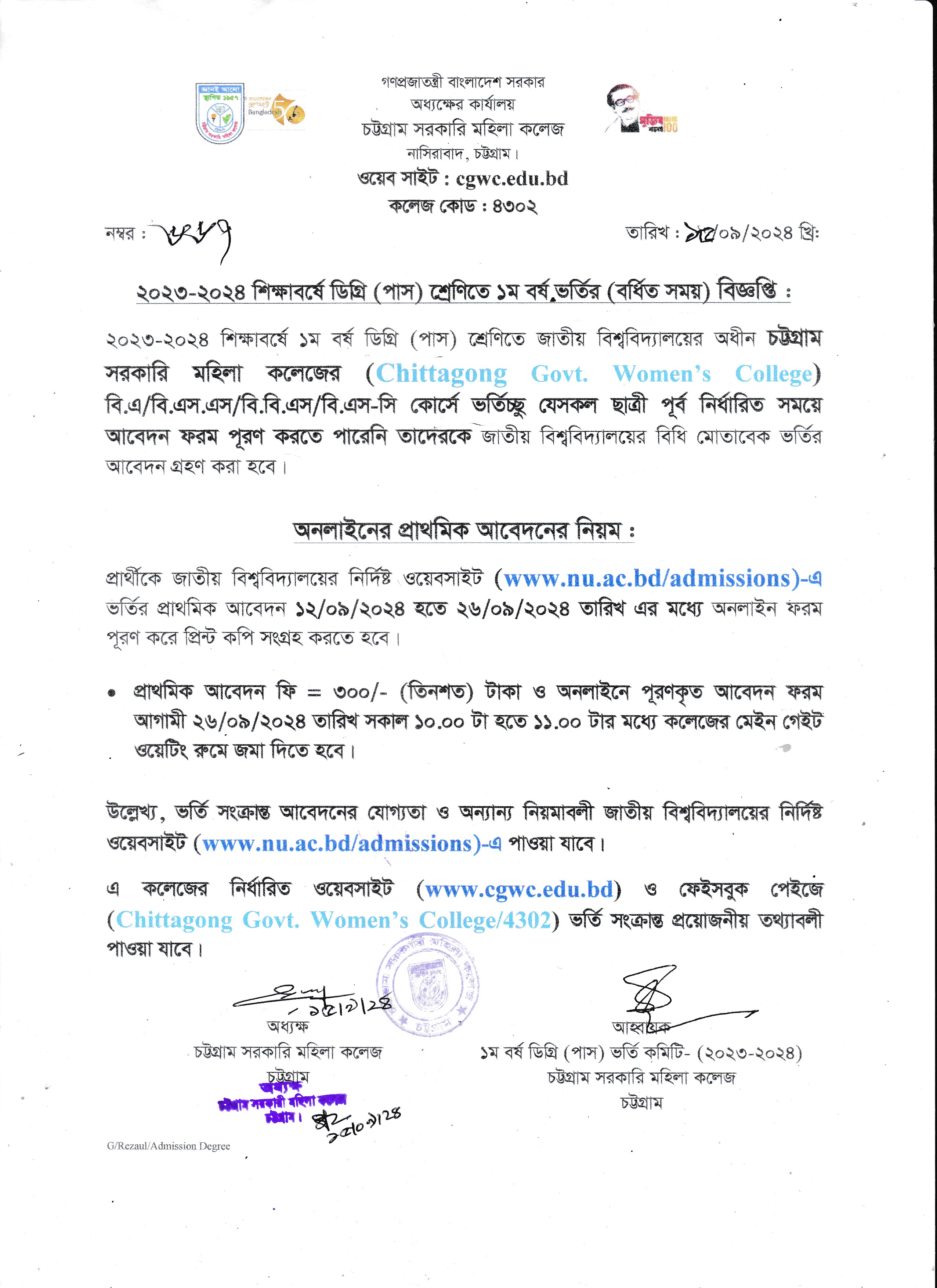 ২০২৩-২০২৪ শিক্ষাবর্ষে ডিগ্রি (পাস) ১ম বর্ষে ভর্তির প্রাথমিক আবেদন সংক্রান্ত বিজ্ঞপ্তি (১৫/০৯/২০২৪)