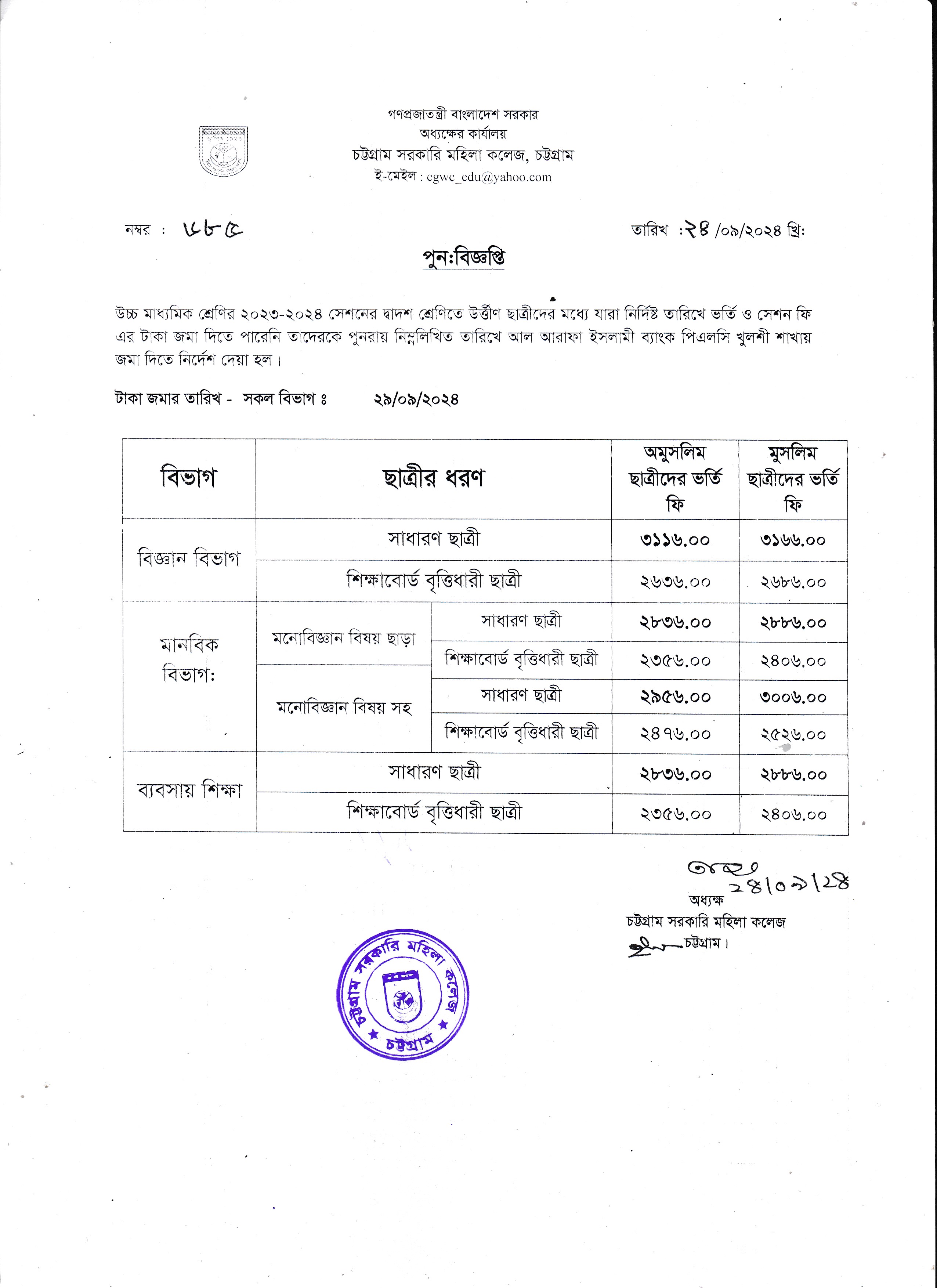 ২০২৩-২০২৪ শিক্ষাবর্ষে দ্বাদশ শ্রেনির ছাত্রীদের ভর্তি ও সেশন ফি জমা দেয়ার পুনঃ বিজ্ঞপ্তি (২৪/০৯/২০২৪)