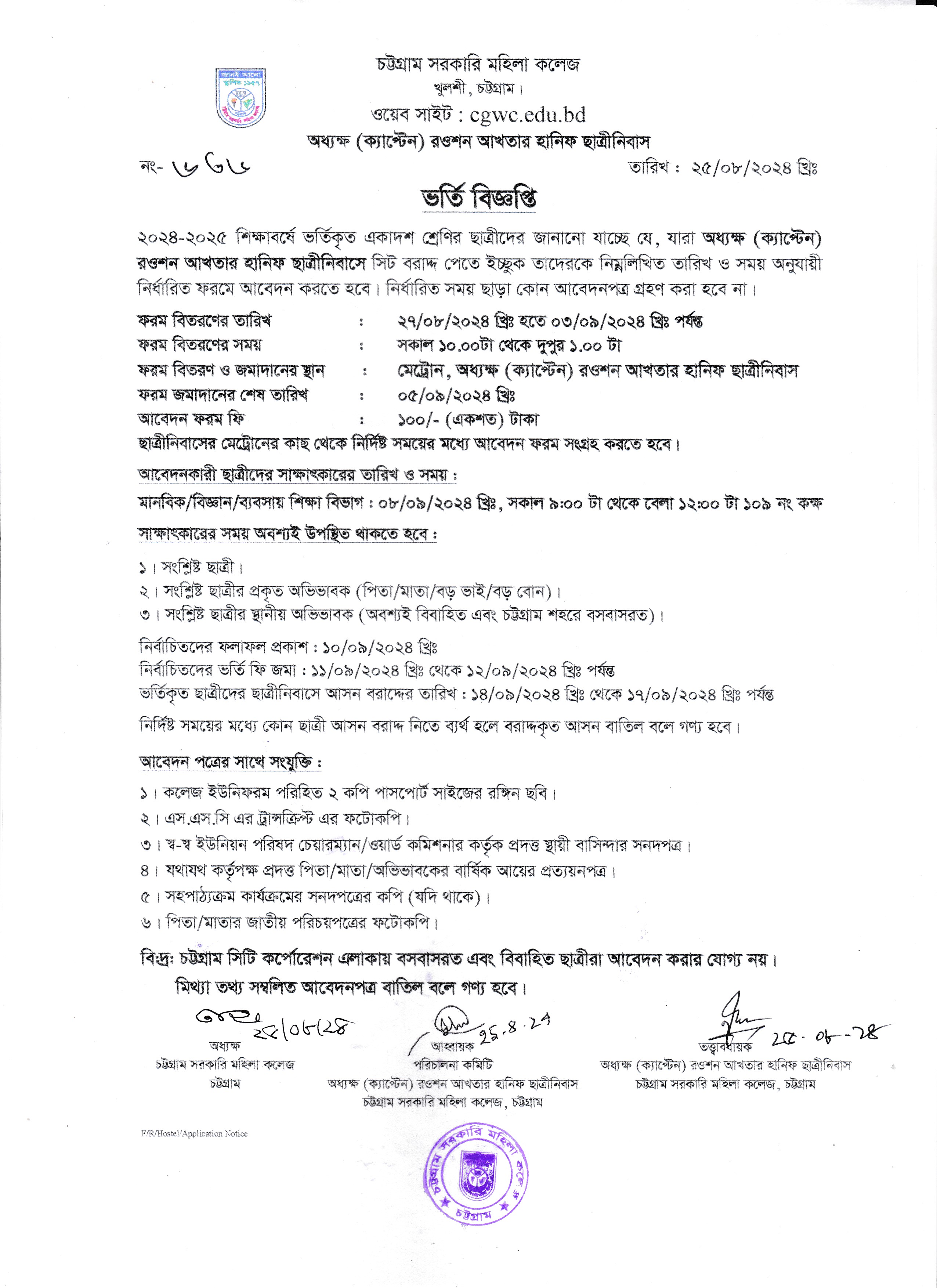 অধ্যক্ষ (ক্যাপ্টেন) রওশন আখতার হানিফ ছাত্রীনিবাসে সিট বরাদ্দের বিজ্ঞপ্তি