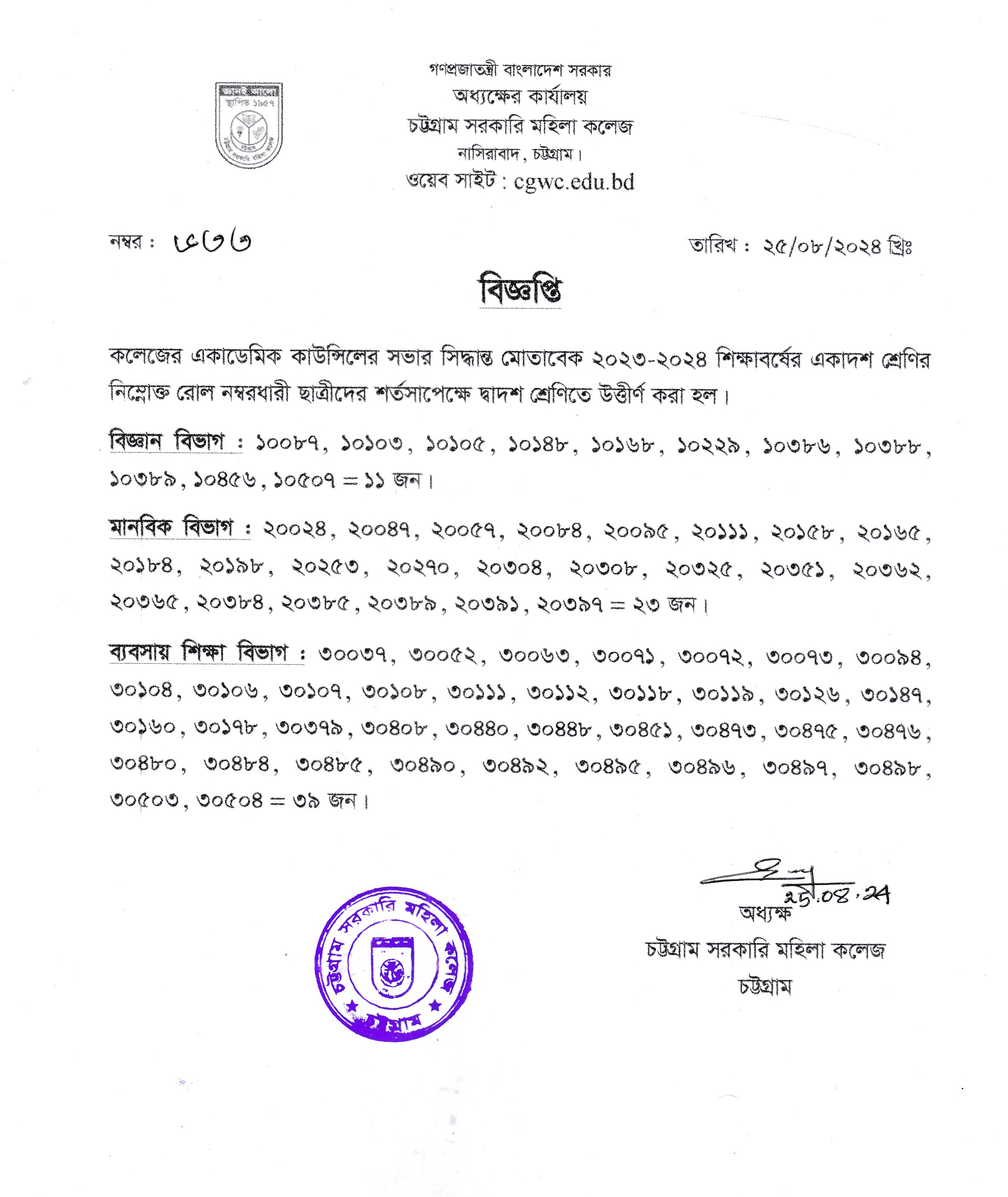 ২০২৩-২০২৪ শিক্ষাবর্ষের নিম্নোক্ত রোলনম্বরধারী ছাত্রীদের দ্বাদশ শ্রেণিতে উত্তীর্ণ করা হলো।