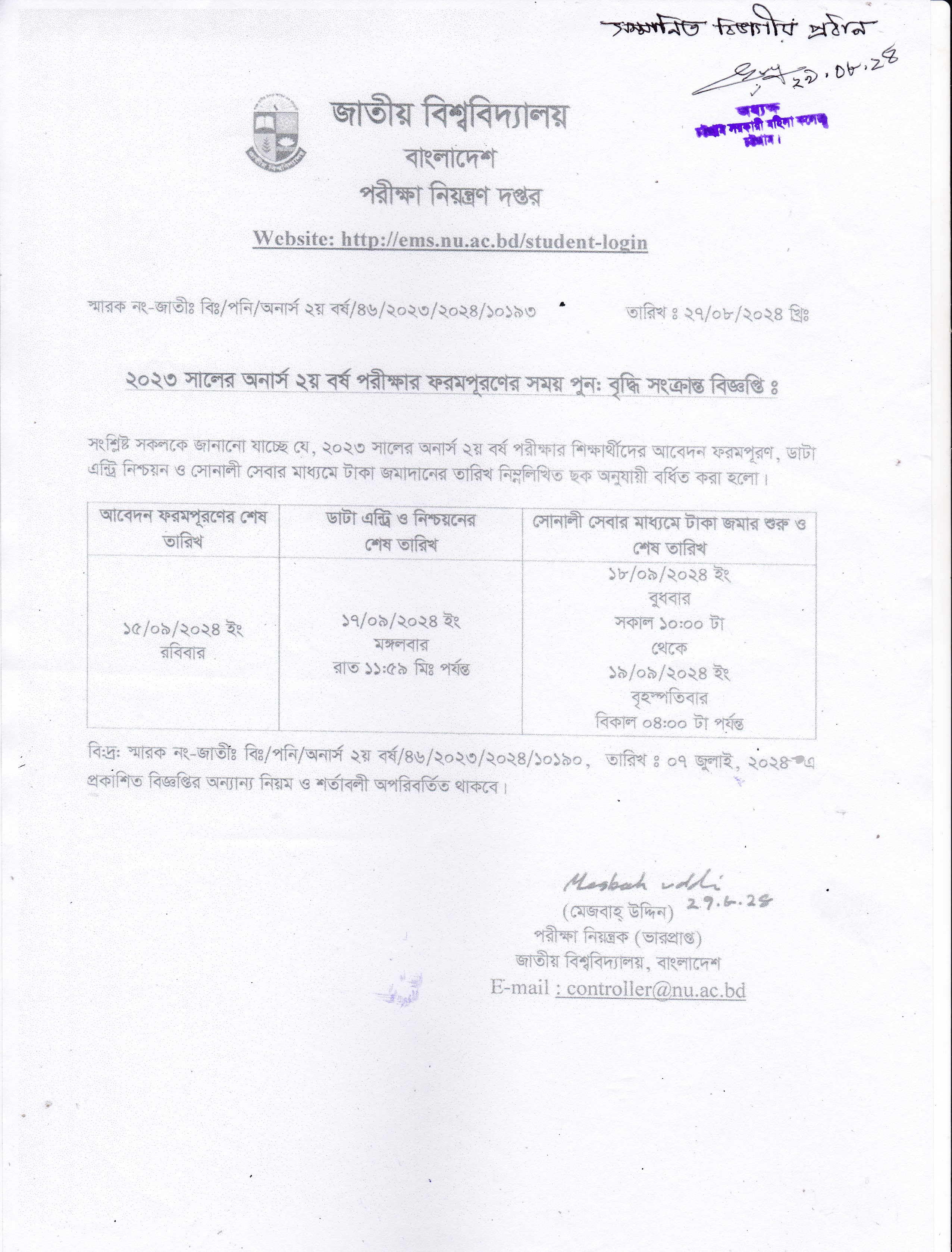 ২০২৩ সালের অনার্স ২য় বর্ষের ফরম পূরণের সময়বৃদ্ধি সংক্রান্ত বিজ্ঞপ্তি (২৯/০৮/২০২৪)