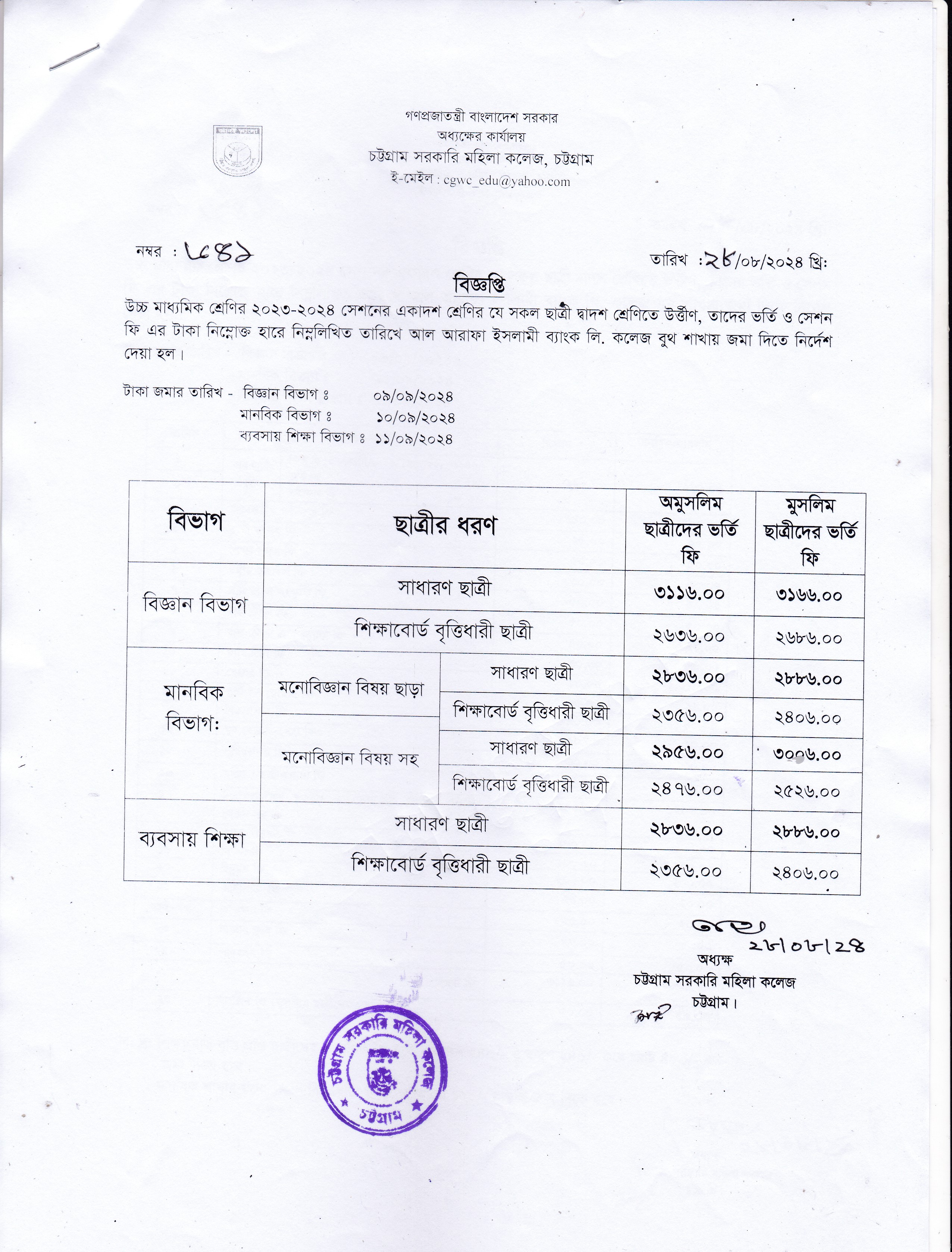 ২০২৩-২০২৪ শিক্ষাবর্ষে একাদশ শ্রেণি থেকে দ্বাদশ শ্রেণিতে উত্তীর্ণ ছাত্রীদের ভর্তি ও সেশন ফি জমা দেয়ার বিজ্ঞপ্তি (২৯/০৮/২০২৪)
