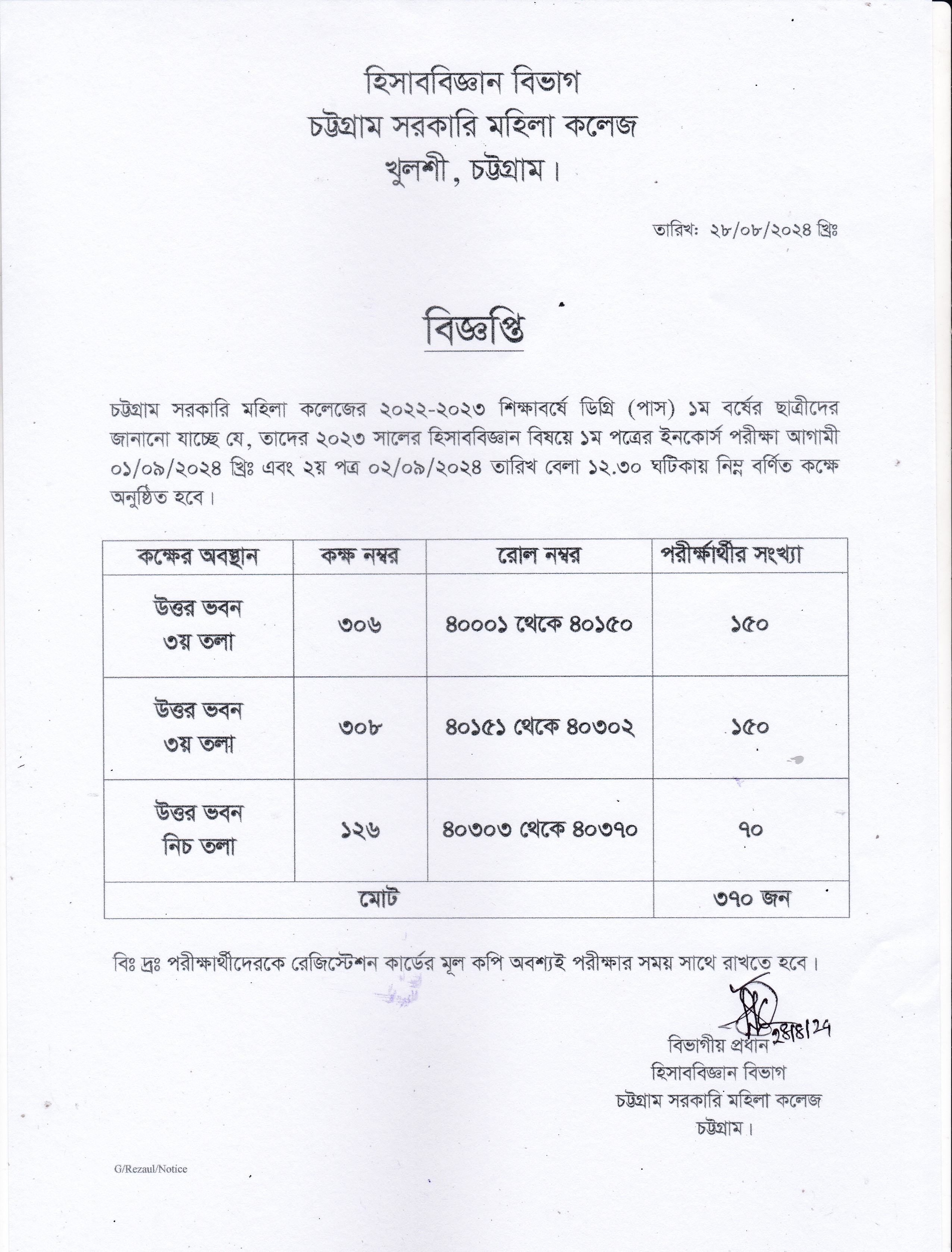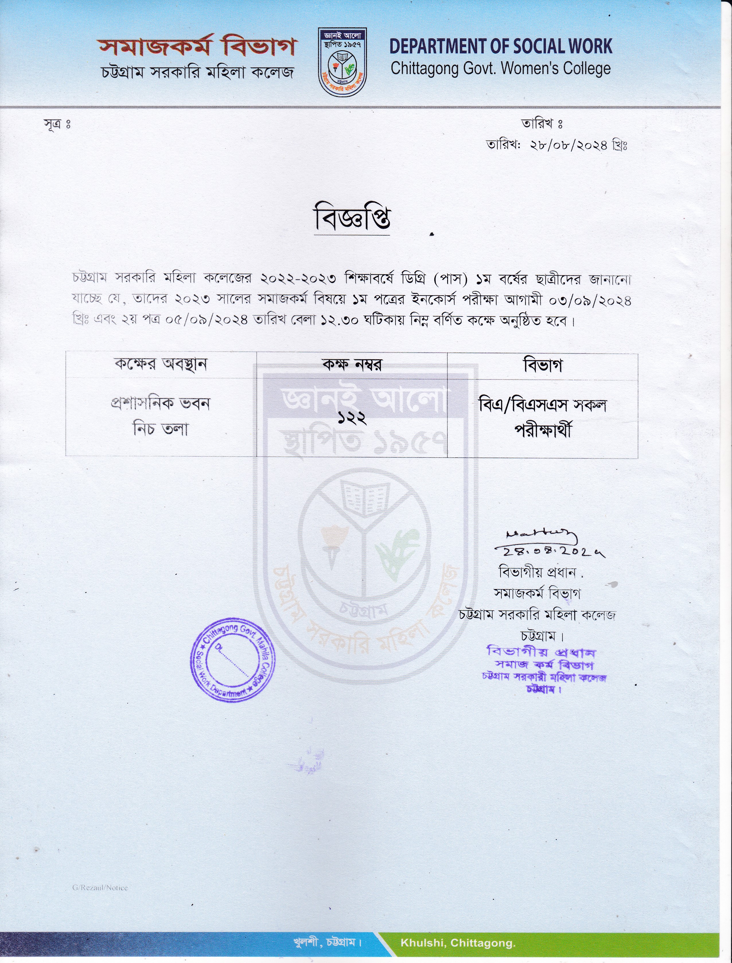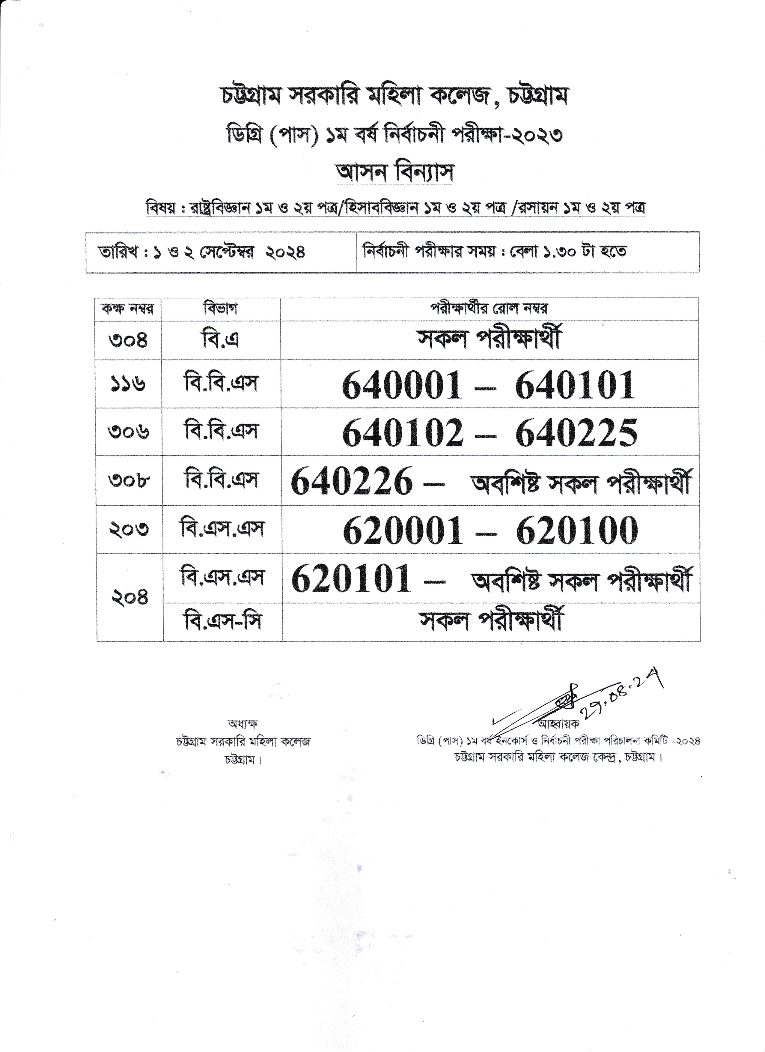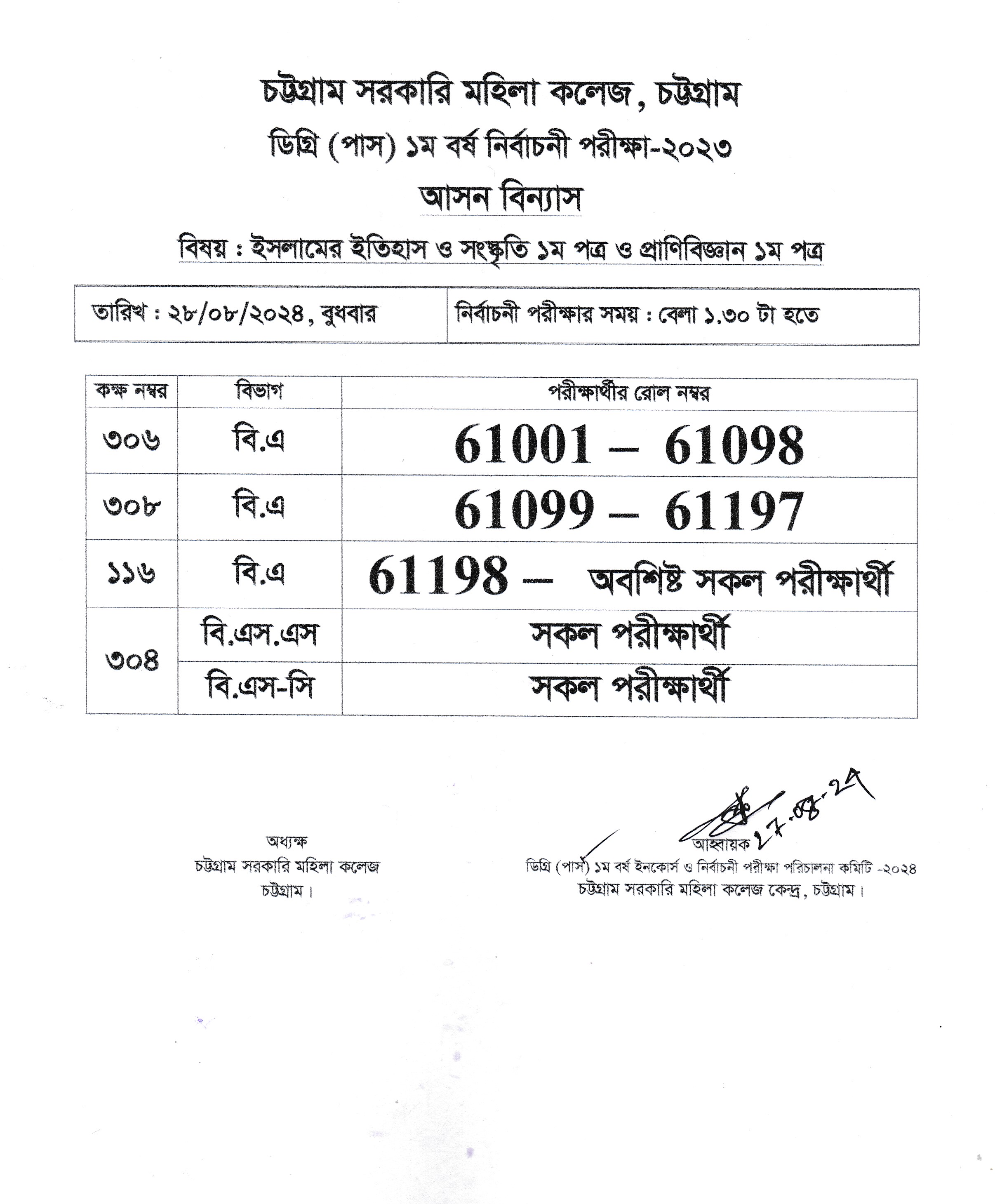 আগামী ২৮/০৮/২০২৪ তারিখের ডিগ্রী পাস ১ম বর্ষ নির্বাচনী পরীক্ষার আসন বিন্যাস