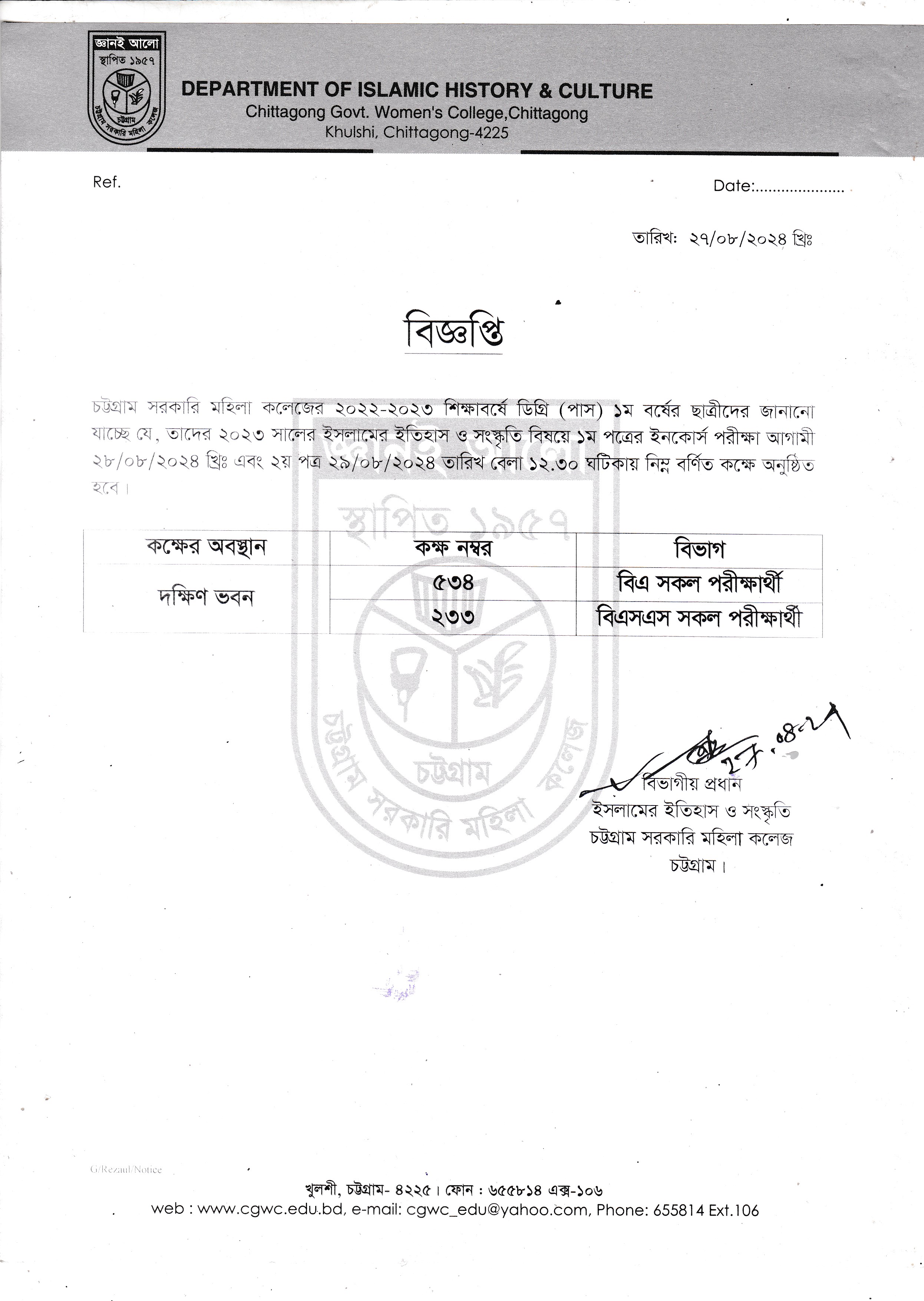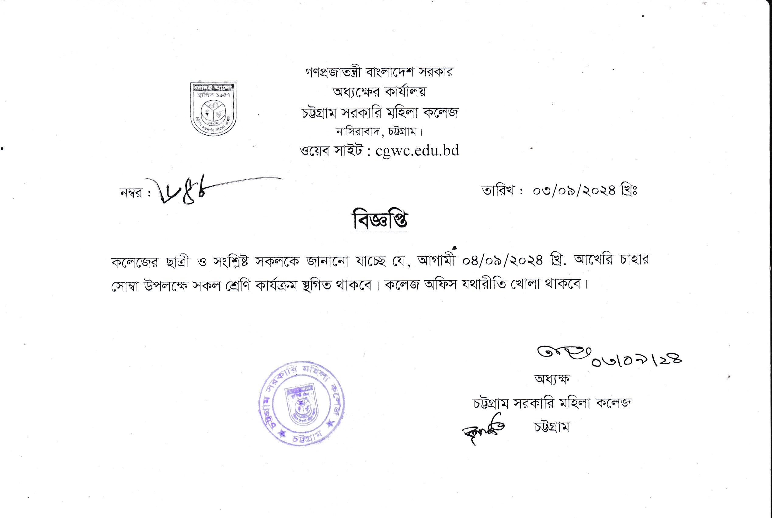 কলেজ বন্ধের বিজ্ঞপ্তি (২৫/০৮/২০২৪)