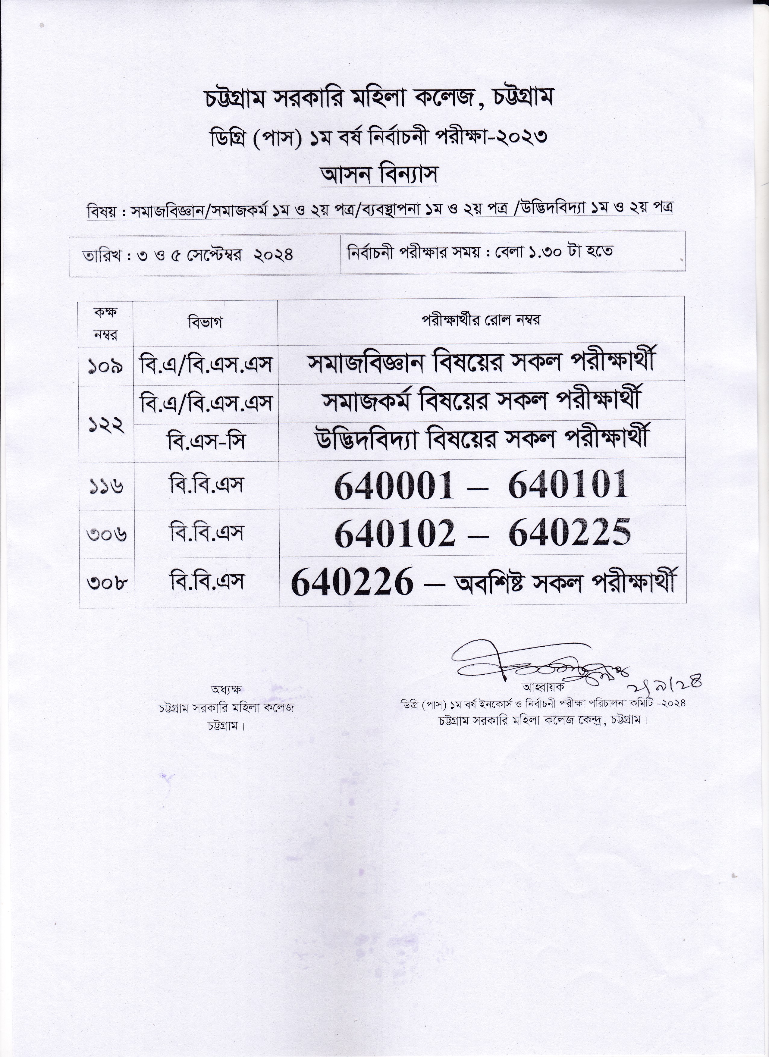 আগামী ৩ ও ৫ সেপ্টেম্বর ২০২৪ তারিখের ডিগ্রী (পাস) ১ম বর্ষ নির্বাচনী পরীক্ষা আসন বিন্যাস