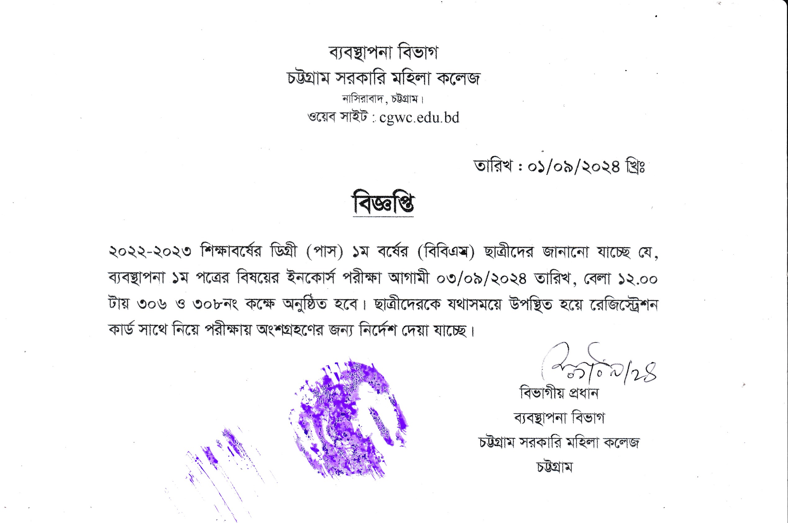 ২০২২-২০২৩ শিক্ষাবর্ষের ডিগ্রী (পাস) ১ম বর্ষের ব্যবস্থাপনা বিষয়ের ইনকোর্স পরীক্ষার সময়সূচি প্রকাশ